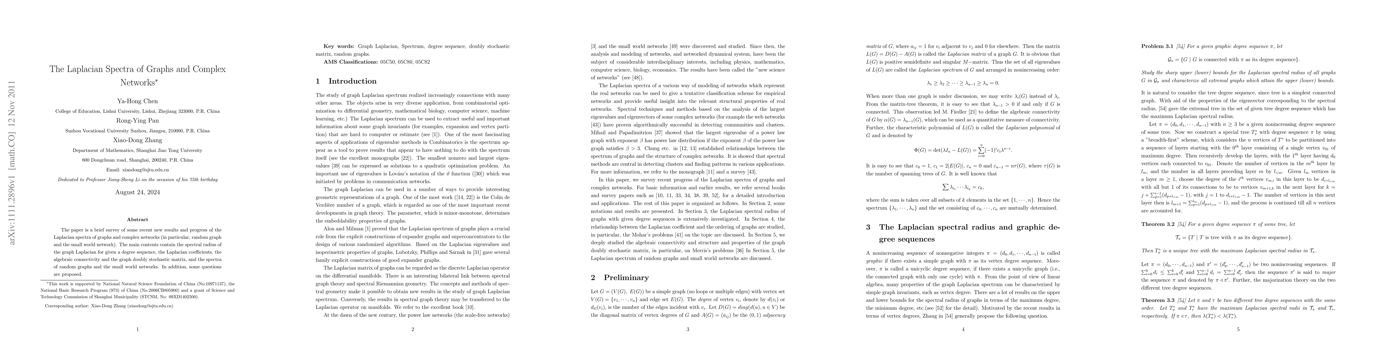 This paper surveys recent advancements in the Laplacian spectra of graphs and complex networks, focusing on spectral radius, Laplacian coefficients, and algebraic connectivity, while also discussing random graphs and small world networks. It proposes several open questions for future research.