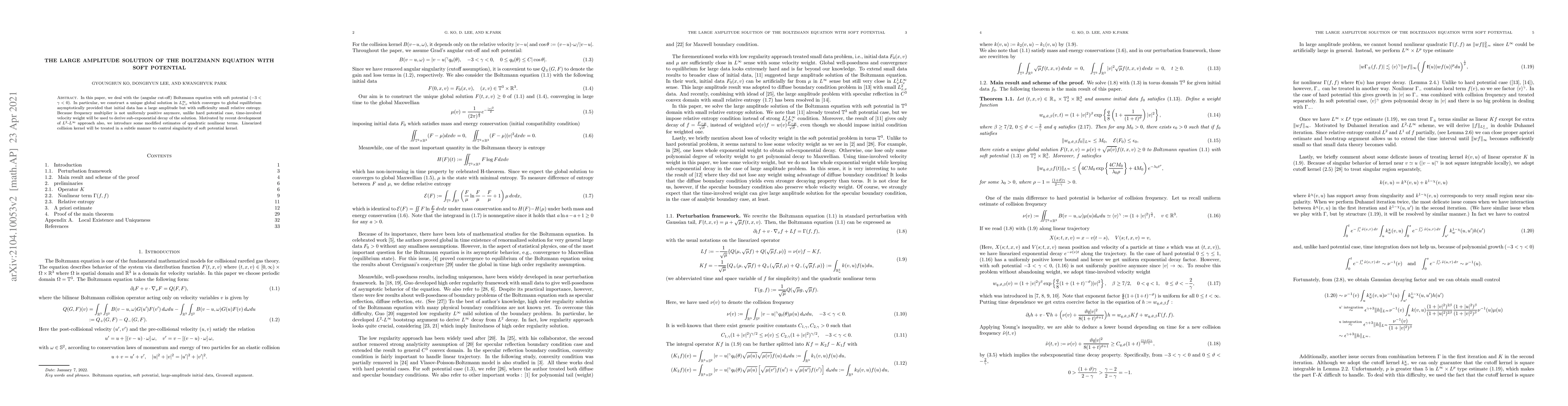 This paper constructs a unique global solution for the Boltzmann equation with soft potential, showing its convergence to global equilibrium under large initial amplitude but with small relative entropy. It employs modified estimates and a time-involved velocity weight to handle the non-uniform positivity of the frequency multiplier, unlike the hard potential case.