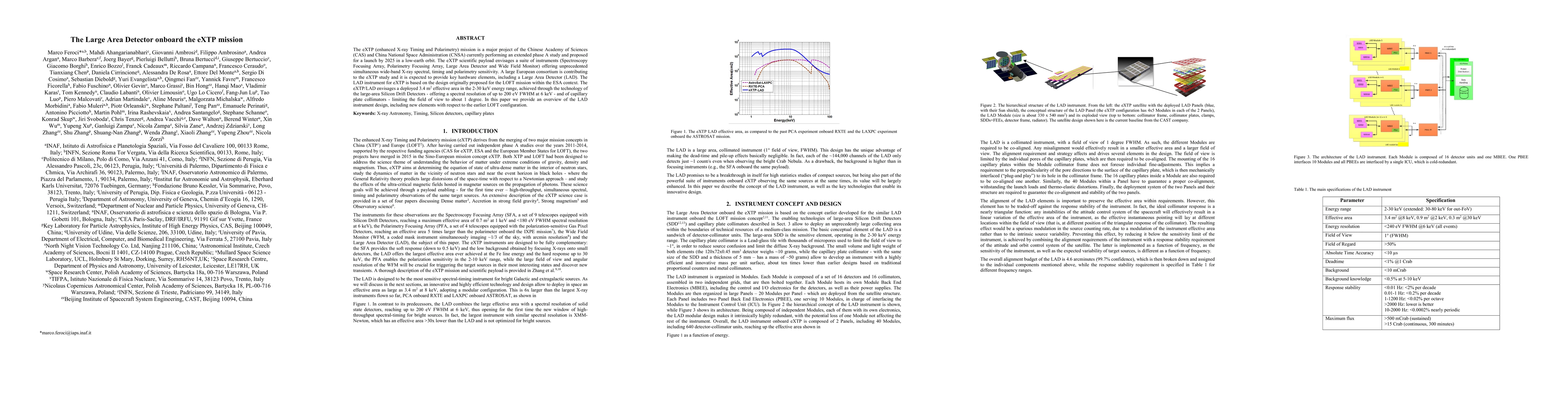 The eXTP mission, a collaborative project between China and Europe, aims to launch a suite of X-ray instruments by 2025, including the Large Area Detector (LAD) based on the LOFT design. The LAD features large-area Silicon Drift Detectors and capillary plate collimators, offering a 3.4 m² effective area and spectral resolution up to 200 eV FWHM at 6 keV.