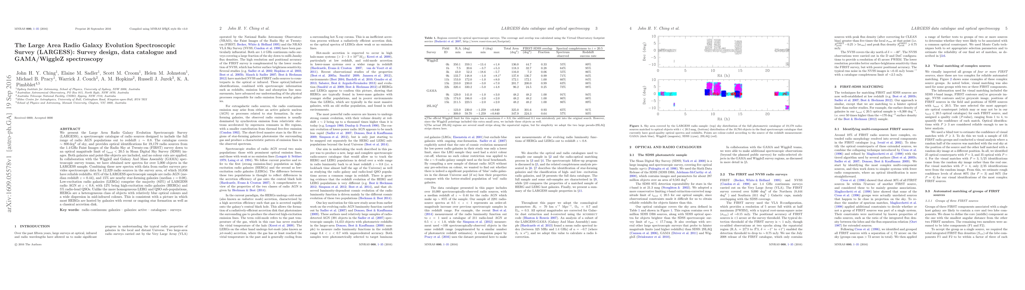 The LARGESS survey catalogues radio sources from the FIRST survey, providing optical identifications and spectra for 19,179 radio sources, with 10,856 having reliable redshifts. The majority of the spectroscopic sample are low-excitation radio galaxies (LERGs), while high-excitation radio galaxies (HERGs) show a wide dispersion in mid-infrared colours, suggesting recent or ongoing star formation.