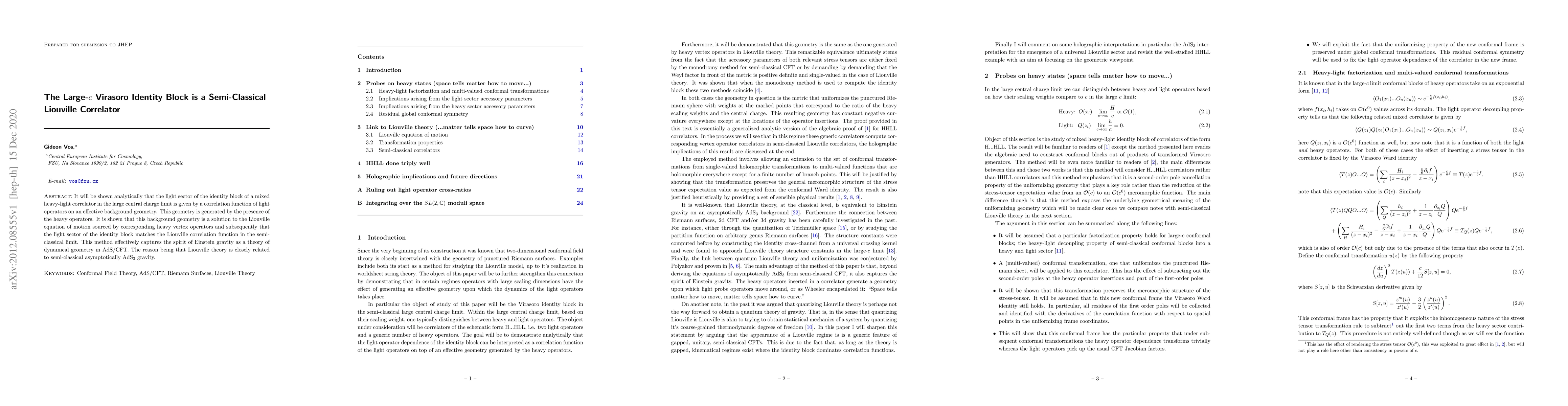 It will be shown analytically that the light sector of the identity block of a mixed heavy-light correlator in the large central charge limit is given by a correlation function of light operators on an effective background geometry. This geometry is generated by the presence of the heavy operators. It is shown that this background geometry is a solution to the Liouville equation of motion sourced by corresponding heavy vertex operators and subsequently that the light sector of the identity block matches the Liouville correlation function in the semi-classical limit. This method effectively captures the spirit of Einstein gravity as a theory of dynamical geometry in AdS/CFT. The reason being that Liouville theory is closely related to semi-classical asymptotically AdS$_3$ gravity.