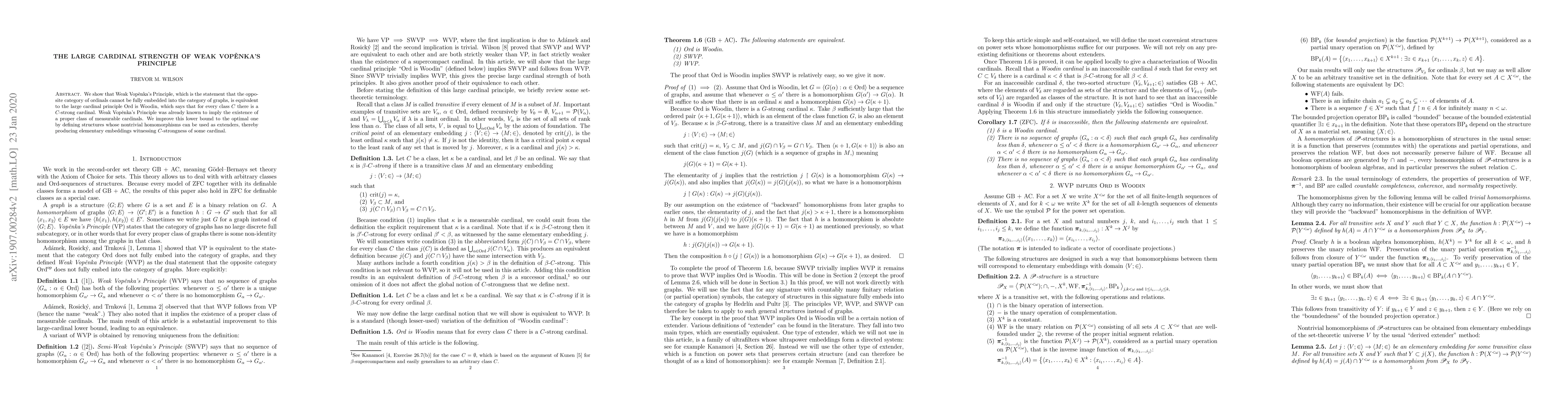 The paper demonstrates that Weak Vopěnka's Principle is equivalent to the large cardinal principle that for every class C, there is a C-strong cardinal. It also refines the known implication of this principle to ensure the existence of a proper class of measurable cardinals.