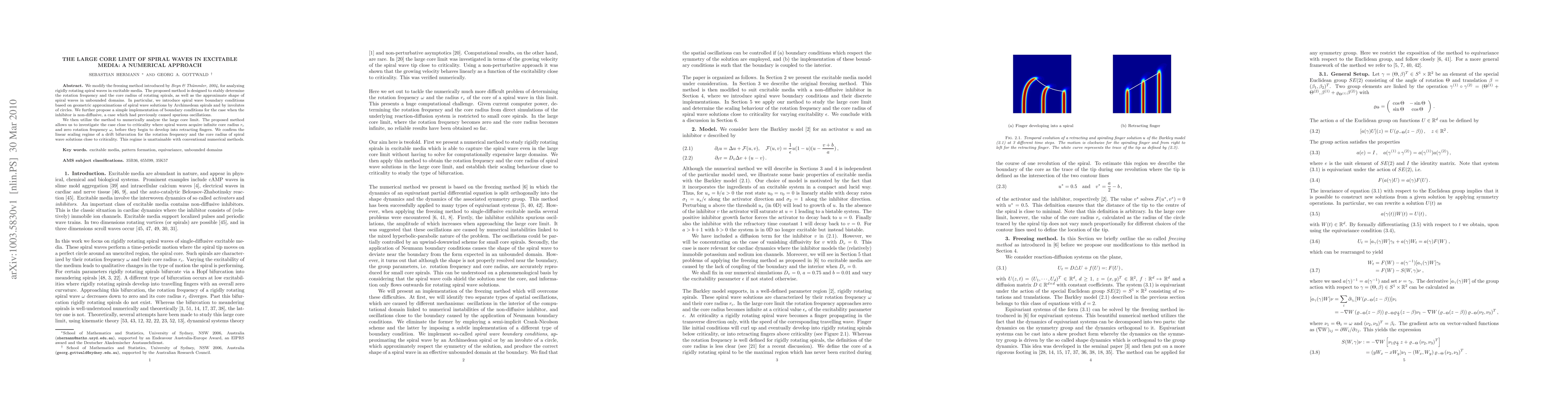 This paper modifies the freezing method to analyze spiral waves in excitable media, introducing new boundary conditions to avoid spurious oscillations. It numerically investigates the large core limit of spiral waves near criticality, confirming a linear scaling regime for rotation frequency and core radius.