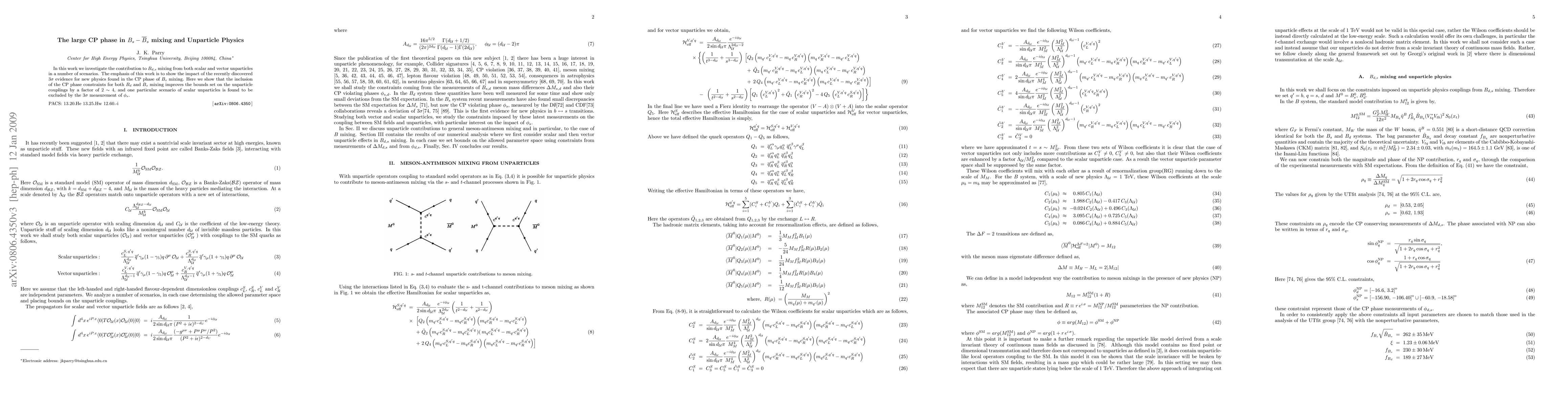In this work we investigate the contribution to B(d,s) mixing from both scalar and vector unparticles in a number of scenarios. The emphasis of this work is to show the impact of the recently discovered 3 sigma evidence for new physics found in the CP phase of B(s) mixing. Here we show that the inclusion of the CP phase constraints for both B(d) and B(s) mixing improves the bounds set on the unparticle couplings by a factor of 2~4, and one particular scenario of scalar unparticles is found to be excluded by the 3 sigma measurement of phi(s).