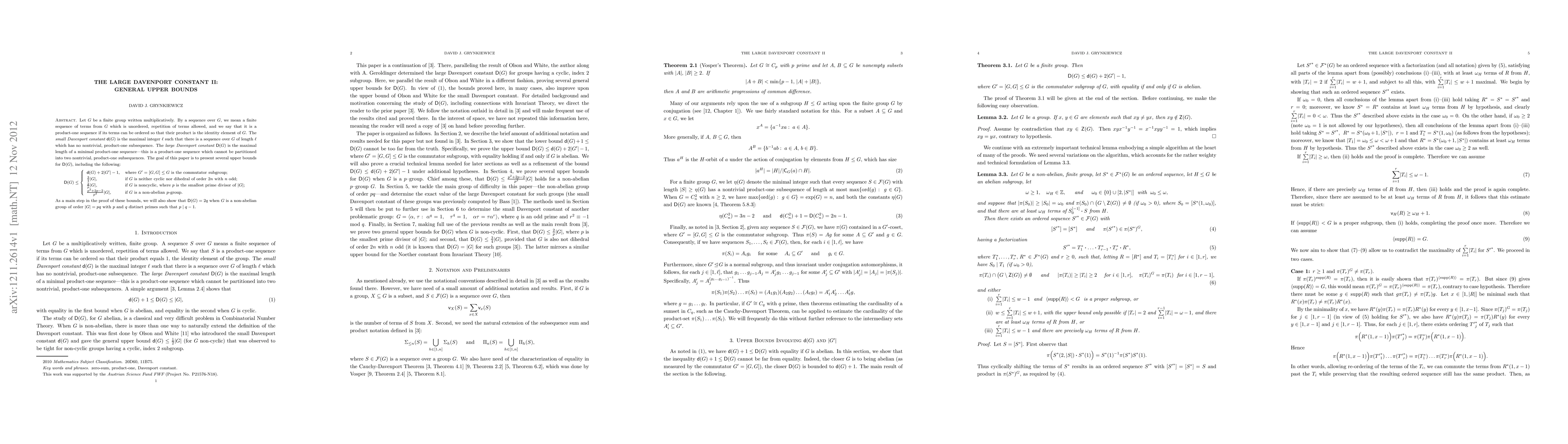 This paper investigates upper bounds for the large Davenport constant $\mathsf D(G)$ of a finite group $G$, establishing bounds such as $\mathsf D(G)\leq ll \mathsf d(G)+2|G'|-1$ and $\mathsf D(G) \leq \frac{3}{4}|G|$ for non-cyclic groups, among others. The study also proves $\mathsf D(G)=2q$ for specific non-abelian groups of order $|G|=pq$.