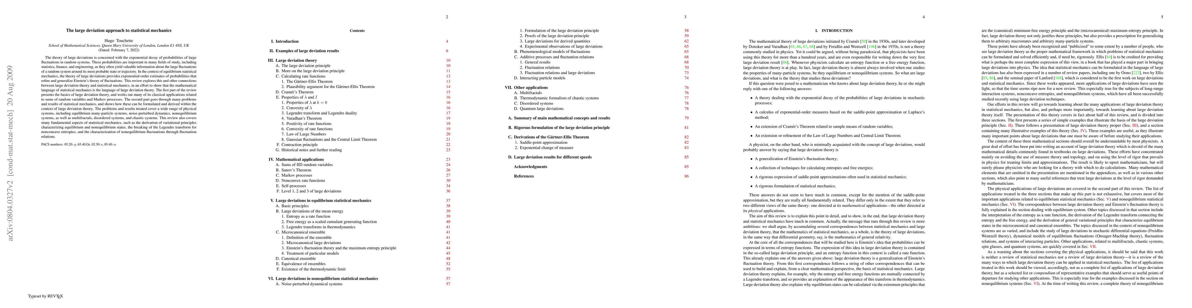 This paper reviews the application of large deviation theory to statistical mechanics, illustrating how it provides refined estimates of probabilities for large fluctuations in random systems. It connects classical statistical mechanics problems with large deviation theory, covering diverse physical systems and fundamental aspects like variational principles and fluctuation relations.