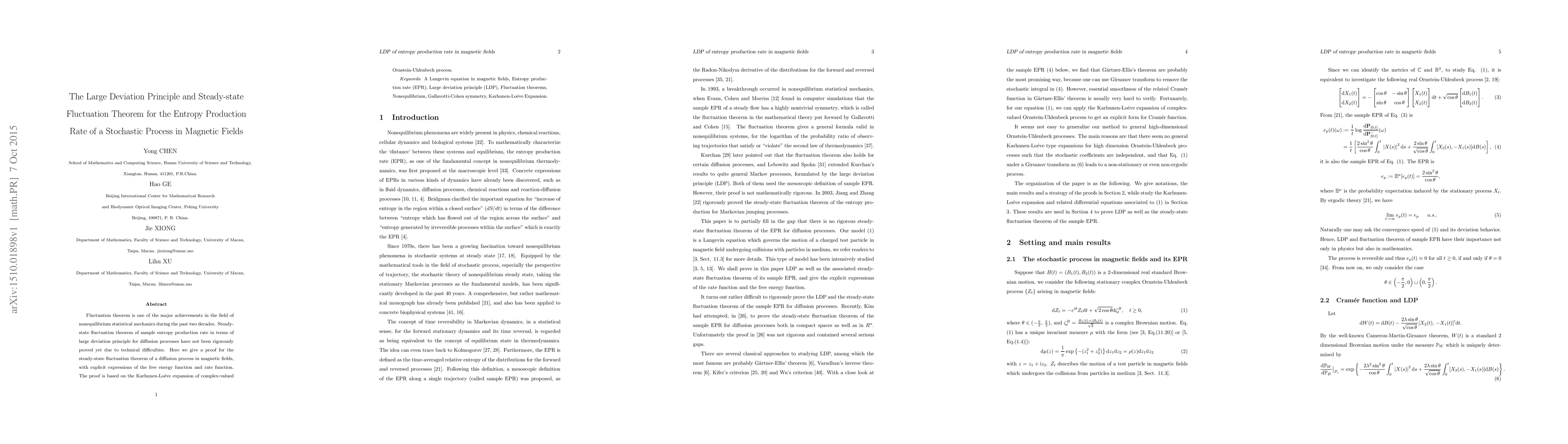 This paper rigorously proves the steady-state fluctuation theorem for entropy production rate in diffusion processes under magnetic fields, utilizing the Karhunen-Loève expansion of complex-valued Ornstein-Uhlenbeck processes to derive explicit expressions for the free energy function and rate function.