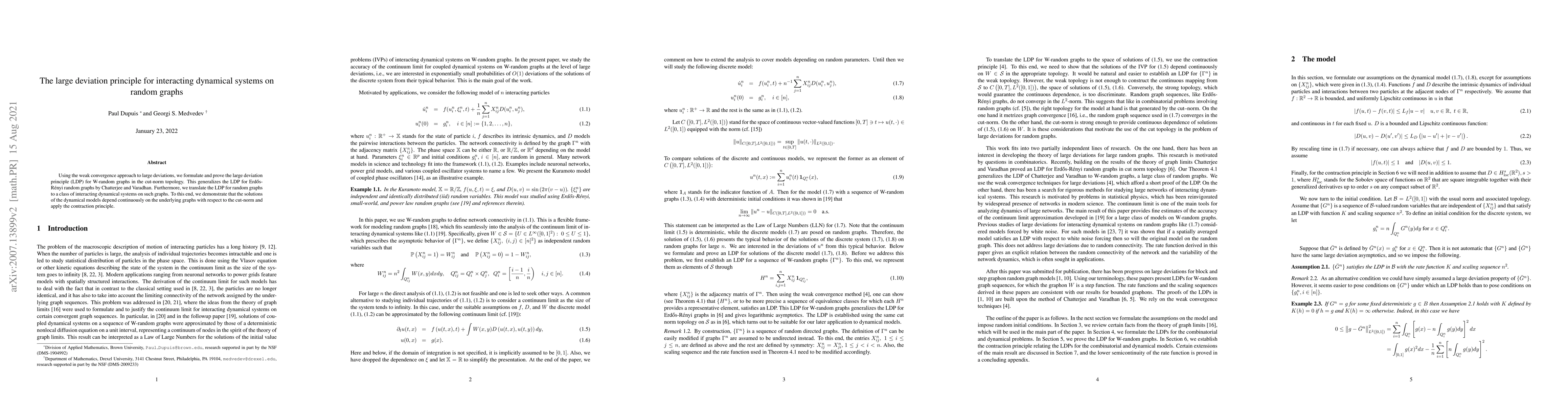 This paper formulates and proves the large deviation principle (LDP) for W-random graphs in the cut-norm topology, extending Chatterjee and Varadhan's results for Erdős-Rényi graphs. It also translates the LDP for random graphs to interacting dynamical systems on these graphs, showing continuous dependence on the underlying graph structure.