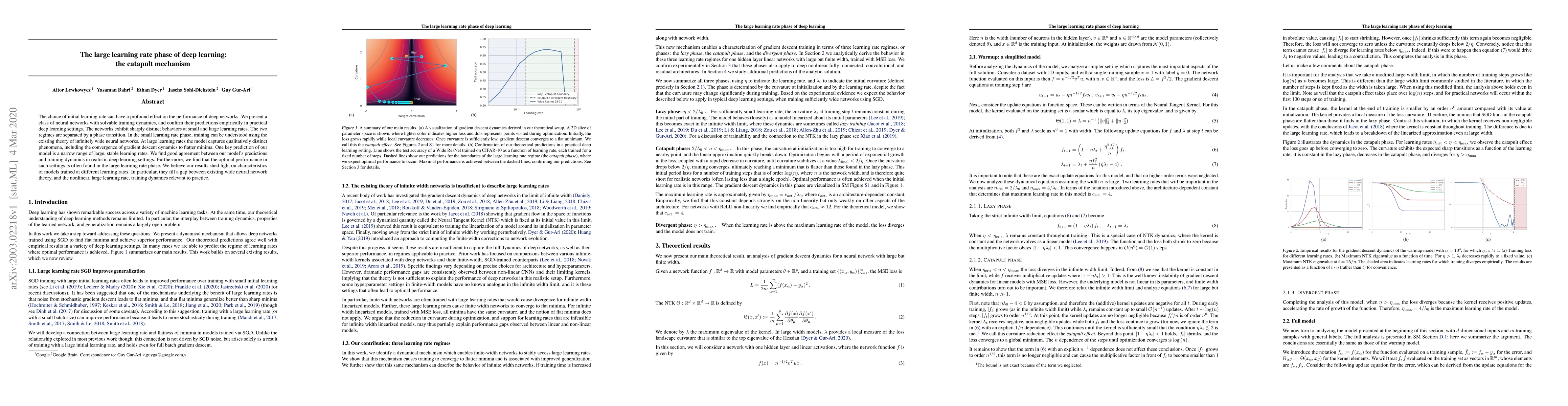 The choice of initial learning rate can have a profound effect on the performance of deep networks. We present a class of neural networks with solvable training dynamics, and confirm their predictions empirically in practical deep learning settings. The networks exhibit sharply distinct behaviors at small and large learning rates. The two regimes are separated by a phase transition. In the small learning rate phase, training can be understood using the existing theory of infinitely wide neural networks. At large learning rates the model captures qualitatively distinct phenomena, including the convergence of gradient descent dynamics to flatter minima. One key prediction of our model is a narrow range of large, stable learning rates. We find good agreement between our model's predictions and training dynamics in realistic deep learning settings. Furthermore, we find that the optimal performance in such settings is often found in the large learning rate phase. We believe our results shed light on characteristics of models trained at different learning rates. In particular, they fill a gap between existing wide neural network theory, and the nonlinear, large learning rate, training dynamics relevant to practice.