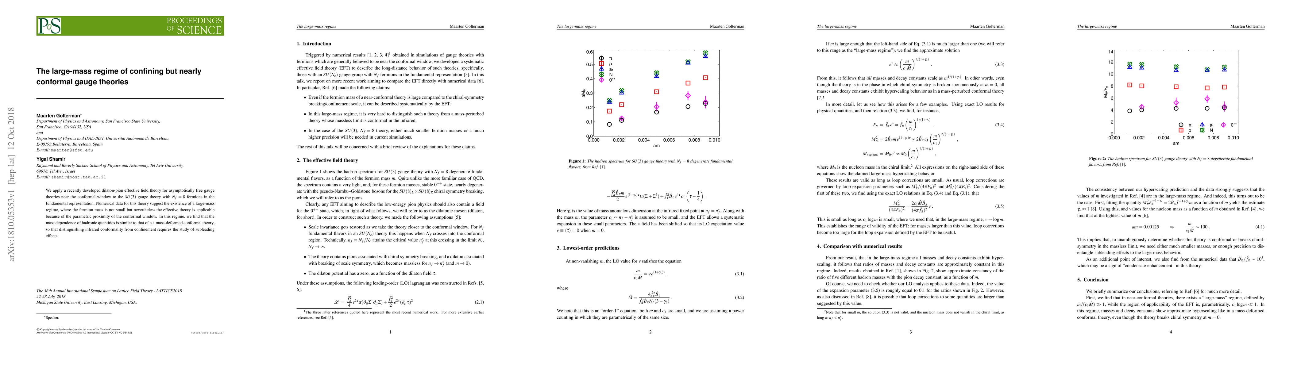 We apply a recently developed dilaton-pion effective field theory for asymptotically free gauge theories near the conformal window to the $SU(3)$ gauge theory with $N_f=8$ fermions in the fundamental representation. Numerical data for this theory suggest the existence of a large-mass regime, where the fermion mass is not small but nevertheless the effective theory is applicable because of the parametric proximity of the conformal window. In this regime, we find that the mass dependence of hadronic quantities is similar to that of a a mass-deformed conformal theory, so that distinguishing infrared conformality from confinement requires the study of subleading effects.