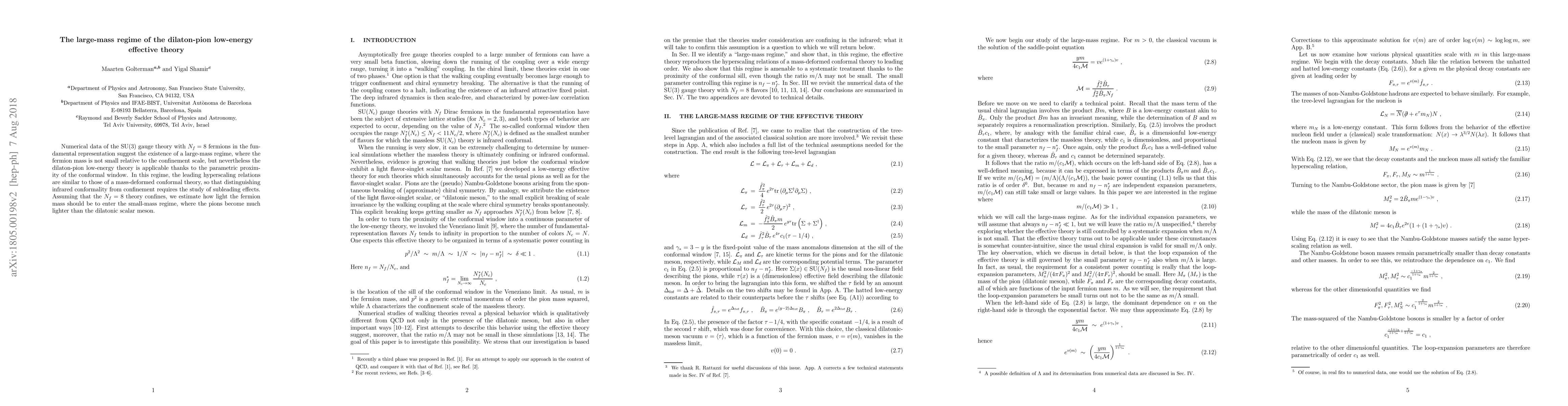 Numerical data of the SU(3) gauge theory with $N_f=8$ fermions in the fundamental representation suggest the existence of a large-mass regime, where the fermion mass is not small relative to the confinement scale, but nevertheless the dilaton-pion low-energy theory is applicable thanks to the parametric proximity of the conformal window. In this regime, the leading hyperscaling relations are similar to those of a mass-deformed conformal theory, so that distinguishing infrared conformality from confinement requires the study of subleading effects. Assuming that the $N_f=8$ theory confines, we estimate how light the fermion mass should be to enter the small-mass regime, where the pions become much lighter than the dilatonic scalar meson.
