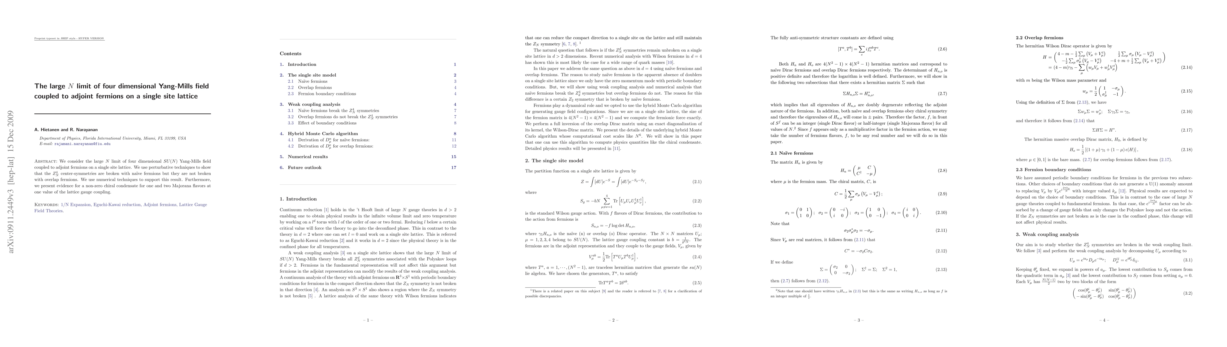 This paper investigates the large N limit of four-dimensional SU(N) Yang-Mills theory coupled to adjoint fermions on a single site lattice, demonstrating that the Z4N center symmetries are broken with naive fermions but preserved with overlap fermions using perturbative and numerical techniques. The study also finds evidence of a non-zero chiral condensate for one and two Majorana flavors at specific lattice gauge coupling values.