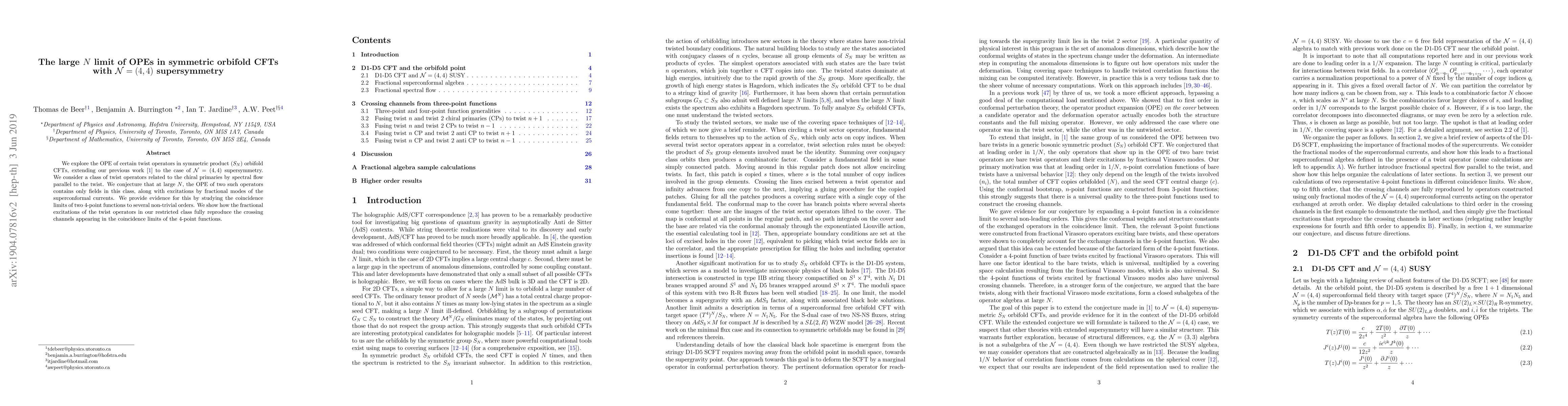 This paper investigates the Operator Product Expansion (OPE) of twist operators in symmetric orbifold Conformal Field Theories (CFTs) with $\mathcal{N}=(4,4)$ supersymmetry, focusing on large $N$ limits. The authors conjecture that at large $N$, the OPE of certain twist operators only includes fields from a specific class and fractional excitations of superconformal currents, supported by detailed analysis of 4-point functions.