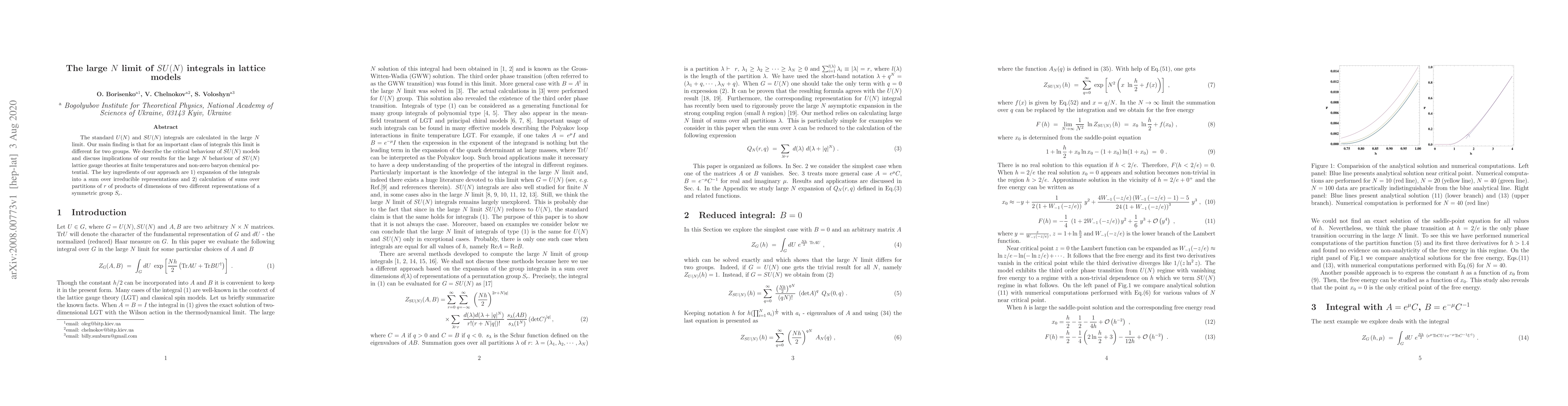 This paper investigates the large N limit of SU(N) integrals in lattice models, finding that the limit differs for SU(N) compared to U(N). The study employs expansions into irreducible representations and calculations of sums over partitions to describe the critical behavior of SU(N) models, with implications for SU(N) lattice gauge theories at finite temperatures and non-zero baryon chemical potential.
