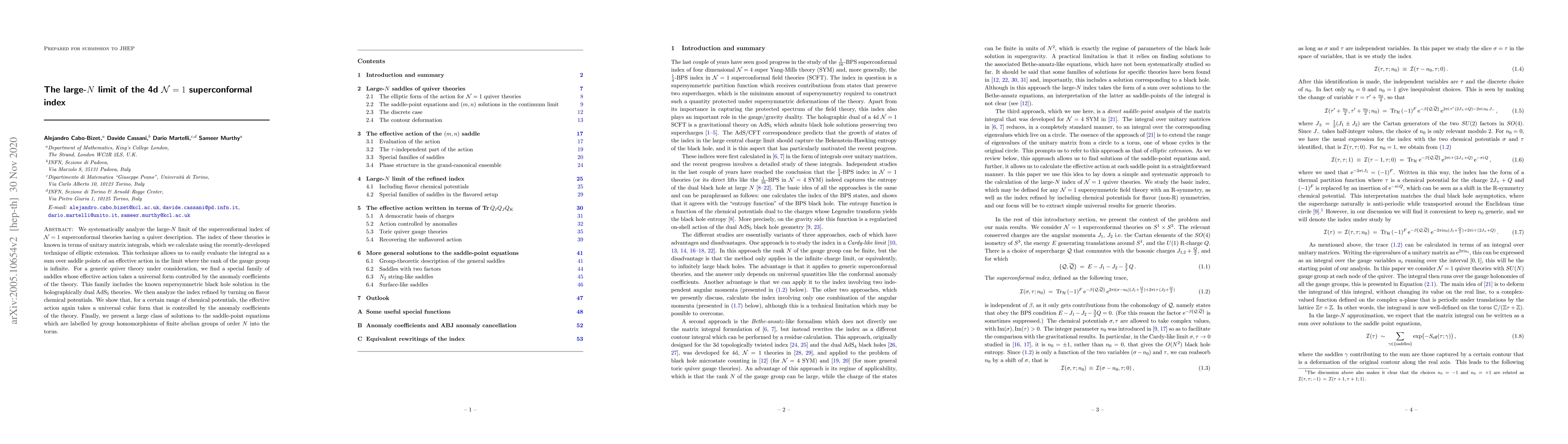 We systematically analyze the large-$N$ limit of the superconformal index of $\mathcal{N}=1$ superconformal theories having a quiver description. The index of these theories is known in terms of unitary matrix integrals, which we calculate using the recently-developed technique of elliptic extension. This technique allows us to easily evaluate the integral as a sum over saddle points of an effective action in the limit where the rank of the gauge group is infinite. For a generic quiver theory under consideration, we find a special family of saddles whose effective action takes a universal form controlled by the anomaly coefficients of the theory. This family includes the known supersymmetric black hole solution in the holographically dual AdS$_5$ theories. We then analyze the index refined by turning on flavor chemical potentials. We show that, for a certain range of chemical potentials, the effective action again takes a universal cubic form that is controlled by the anomaly coefficients of the theory. Finally, we present a large class of solutions to the saddle-point equations which are labelled by group homomorphisms of finite abelian groups of order $N$ into the torus.