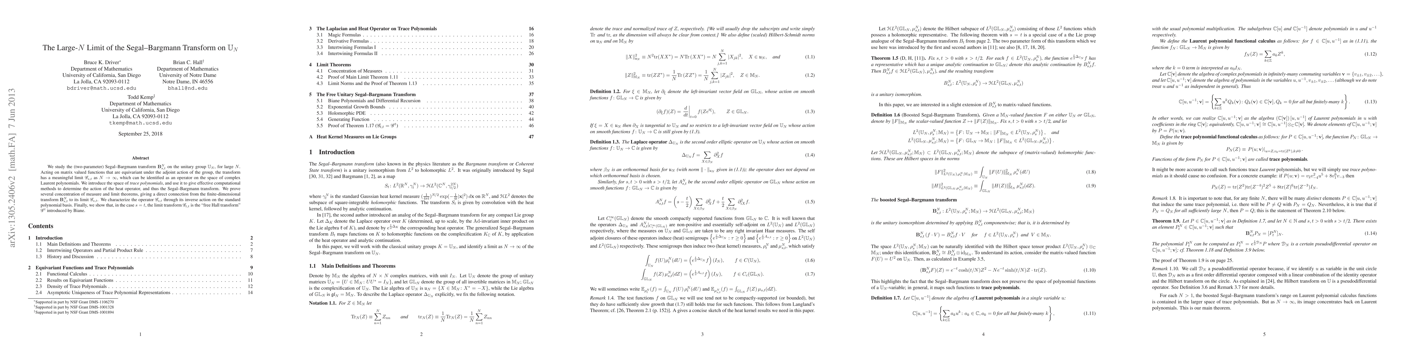 The paper studies the large-$N$ limit of the Segal-Bargmann transform on the unitary group $bU_N$, proving concentration of measure theorems and characterizing its inverse action on a standard polynomial basis.