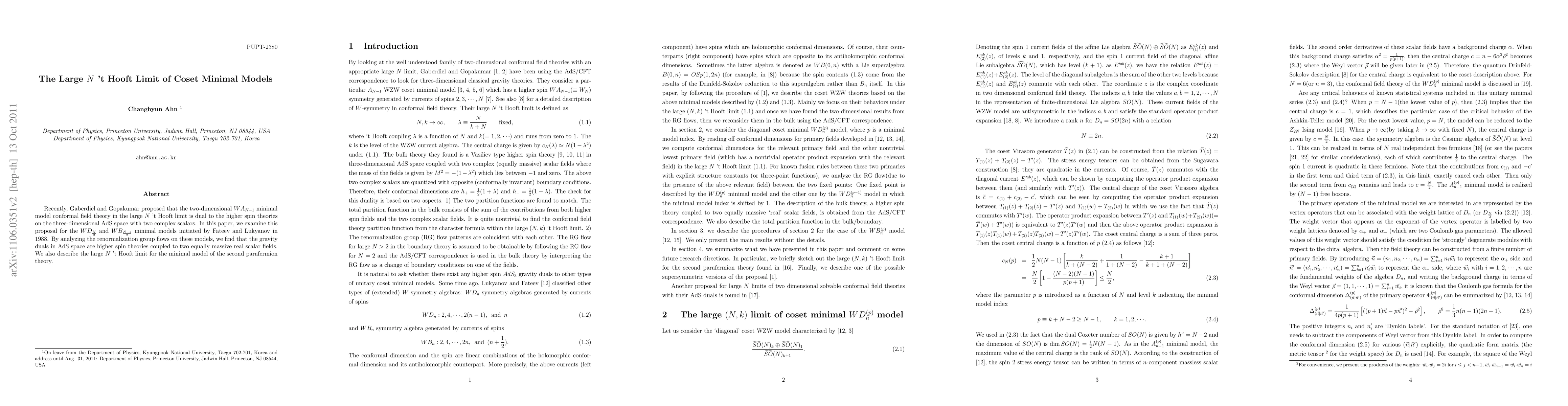 This paper explores the large N 't Hooft limit of WD_{N/2} and WB_{(N-1)/2} coset minimal models, confirming their duality to higher spin theories in three-dimensional AdS space with two equally massive real scalar fields. It also extends the analysis to the minimal model of the second parafermion theory.