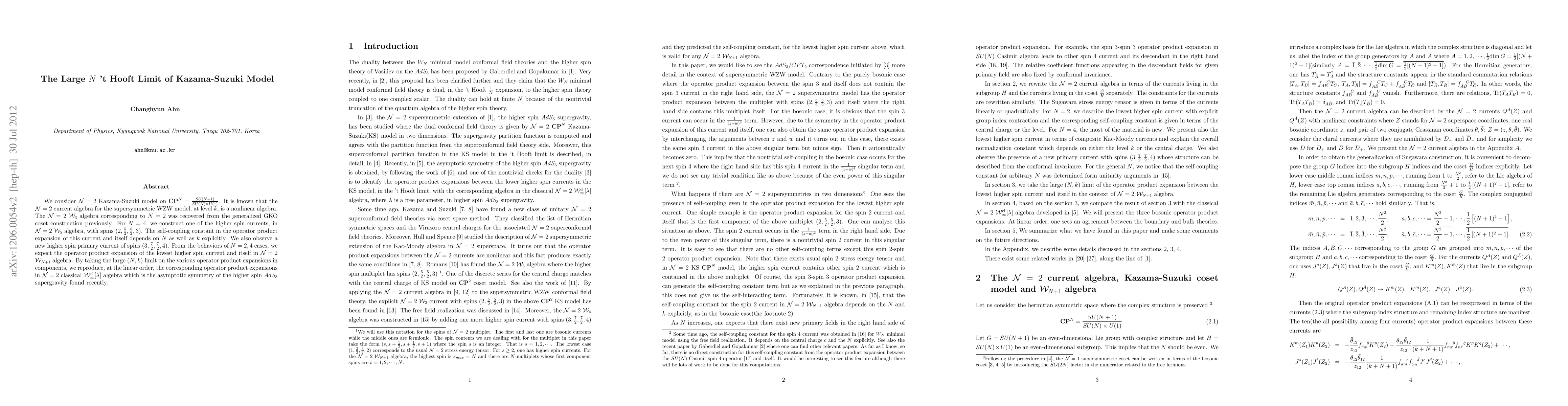 We consider N=2 Kazama-Suzuki model on CP^N=SU(N+1)/SU(N)xU(1). It is known that the N=2 current algebra for the supersymmetric WZW model, at level k, is a nonlinear algebra. The N=2 W_3 algebra corresponding to N=2 was recovered from the generalized GKO coset construction previously. For N=4, we construct one of the higher spin currents, in N=2 W_5 algebra, with spins (2, 5/2, 5/2, 3). The self-coupling constant in the operator product expansion of this current and itself depends on N as well as k explicitly. We also observe a new higher spin primary current of spins (3, 7/2, 7/2, 4). From the behaviors of N=2, 4 cases, we expect the operator product expansion of the lowest higher spin current and itself in N=2 W_{N+1} algebra. By taking the large (N, k) limit on the various operator product expansions in components, we reproduce, at the linear order, the corresponding operator product expansions in N=2 classical W_{\infty}^{cl}[\lambda] algebra which is the asymptotic symmetry of the higher spin AdS_3 supergravity found recently.