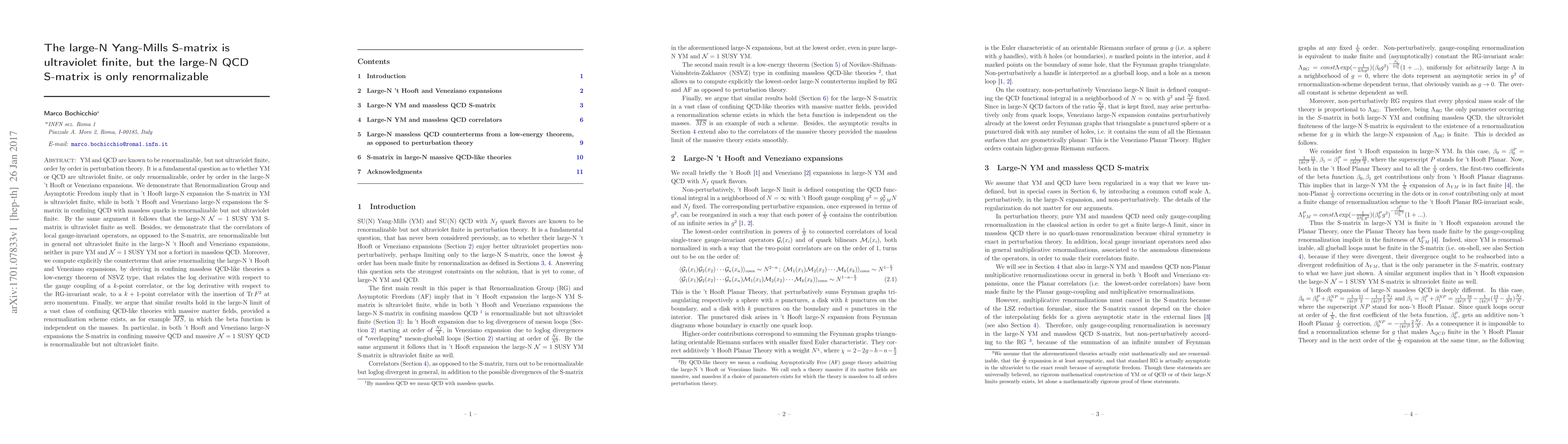 This paper demonstrates that the large-N Yang-Mills (YM) S-matrix is ultraviolet finite, while the large-N Quantum Chromodynamics (QCD) S-matrix is only renormalizable but not ultraviolet finite. It also shows that correlators of local gauge-invariant operators are renormalizable but generally not ultraviolet finite in large-N expansions.