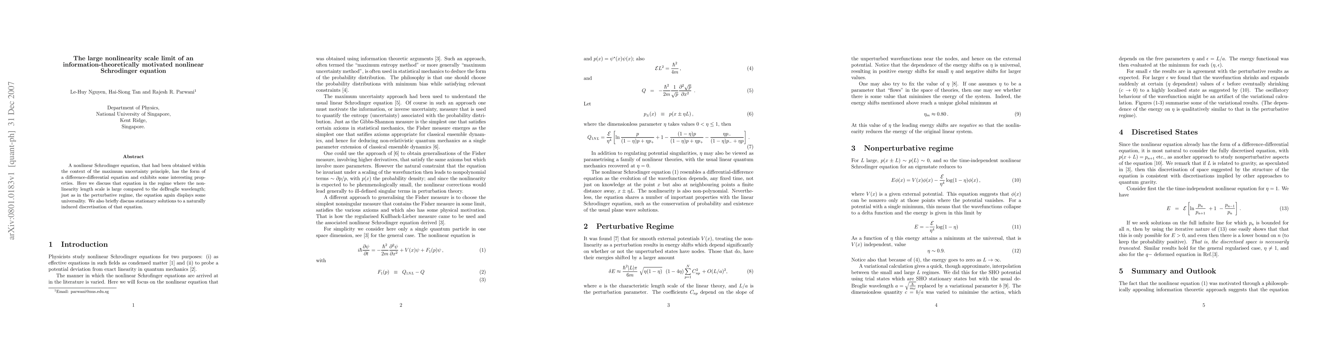 A nonlinear Schrodinger equation, that had been obtained within the context of the maximum uncertainty principle, has the form of a difference-differential equation and exhibits some interesting properties. Here we discuss that equation in the regime where the nonlinearity length scale is large compared to the deBroglie wavelength; just as in the perturbative regime, the equation again displays some universality. We also briefly discuss stationary solutions to a naturally induced discretisation of that equation.