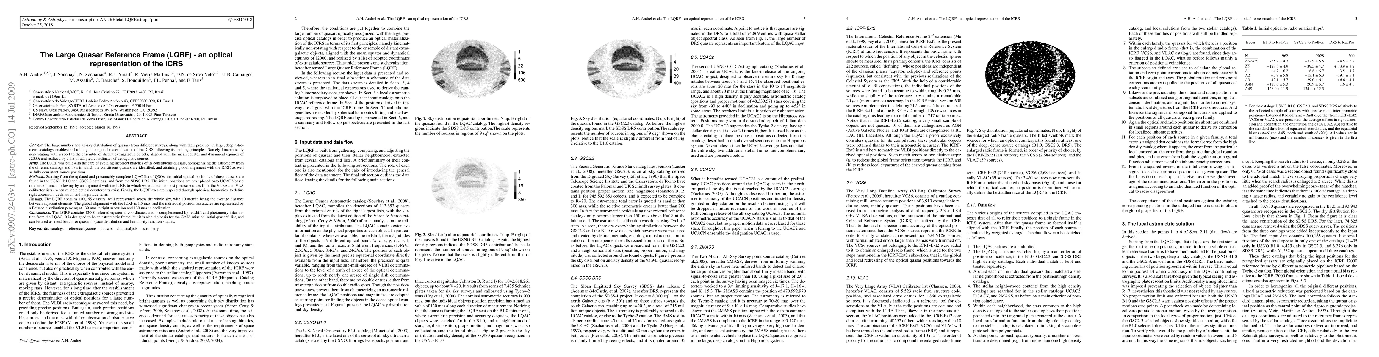 The large number and all-sky distribution of quasars from different surveys, along with their presence in large, deep astrometric catalogs,enables the building of an optical materialization of the ICRS following its defining principles. Namely: that it is kinematically non-rotating with respect to the ensemble of distant extragalactic objects; aligned with the mean equator and dynamical equinox of J2000; and realized by a list of adopted coordinates of extragalatic sources. Starting from the updated and presumably complete LQAC list of QSOs, the initial optical positions of those quasars are found in the USNO B1.0 and GSC2.3 catalogs, and from the SDSS DR5. The initial positions are next placed onto UCAC2-based reference frames, following by an alignment with the ICRF, to which were added the most precise sources from the VLBA calibrator list and the VLA calibrator list - when reliable optical counterparts exist. Finally, the LQRF axes are inspected through spherical harmonics, contemplating to define right ascension, declination and magnitude terms. The LQRF contains J2000 referred equatorial coordinates for 100,165 quasars, well represented across the sky, from -83.5 to +88.5 degrees in declination, and with 10 arcmin being the average distance between adjacent elements. The global alignment with the ICRF is 1.5 mas, and the individual position accuracies are represented by a Poisson distribution that peaks at 139 mas in right ascension and 130 mas in declination. It is complemented by redshift and photometry information from the LQAC. The LQRF is designed to be an astrometric frame, but it is also the basis for the GAIA mission initial quasars' list, and can be used as a test bench for quasars' space distribution and luminosity function studies.