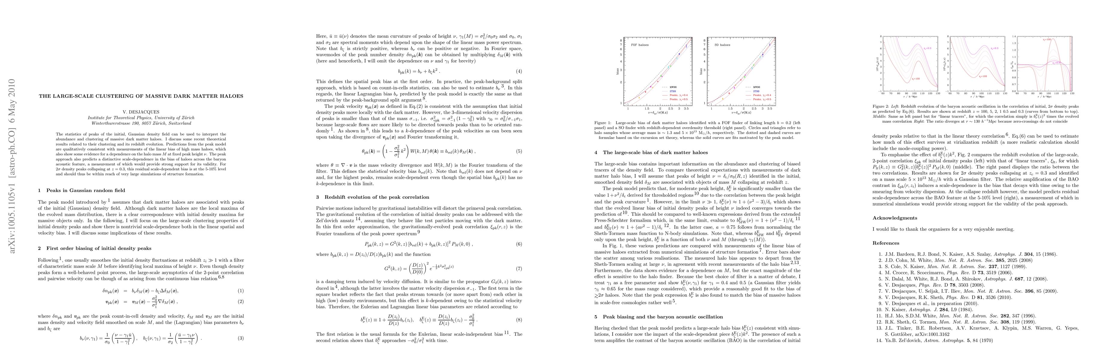 The statistics of peaks of the initial, Gaussian density field can be used to interpret the abundance and clustering of massive dark matter haloes. I discuss some recent theoretical results related to their clustering and its redshift evolution. Predictions from the peak model are qualitatively consistent with measurements of the linear bias of high mass haloes, which also show some evidence for a dependence on the halo mass M at fixed peak height. The peak approach also predicts a distinctive scale-dependence in the bias of haloes across the baryon acoustic feature, a measurement of which would provide strong support for its validity. For 2-sigma density peaks collapsing at z=0.3, this residual scale-dependent bias is at the 5-10 percent level and should thus be within reach of very large simulations of structure formation.