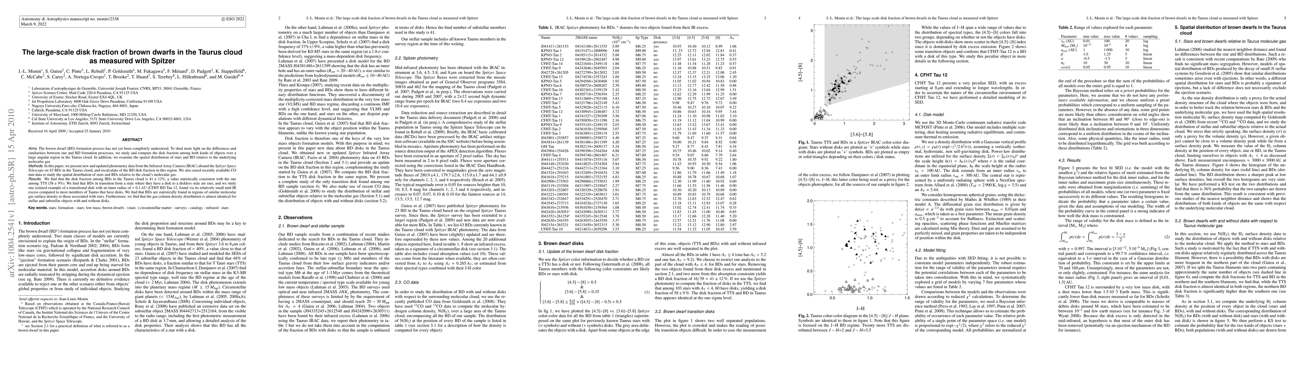 Aims. The brown dwarf (BD) formation process has not yet been completely understood. To shed more light on the differences and similarities between star and BD formation processes, we study and compare the disk fraction among both kinds of objects over a large angular region in the Taurus cloud. In addition, we examine the spatial distribution of stars and BD relative to the underlying molecular gas Methods. In this paper, we present new and updated photometry data from the Infrared Array Camera (IRAC) aboard the Spitzer Space Telescope on 43 BDs in the Taurus cloud, and recalculate of the BD disk fraction in this region. We also useed recently available CO mm data to study the spatial distribution of stars and BDs relative to the cloud's molecular gas. Results. We find that the disk fraction among BDs in the Taurus cloud is 41 \pm 12%, a value statistically consistent with the one among TTS (58 \pm 9%). We find that BDs in transition from a state where they have a disk to a diskless state are rare, and we study one isolated example of a transitional disk with an inner radius of \approx 0.1 AU (CFHT BD Tau 12, found via its relatively small mid-IR excess compared to most members of Taurus that have disks. We find that BDs are statistically found in regions of similar molecular gas surface density to those associated with stars. Furthermore, we find that the gas column density distribution is almost identical for stellar and substellar objects with and without disks.