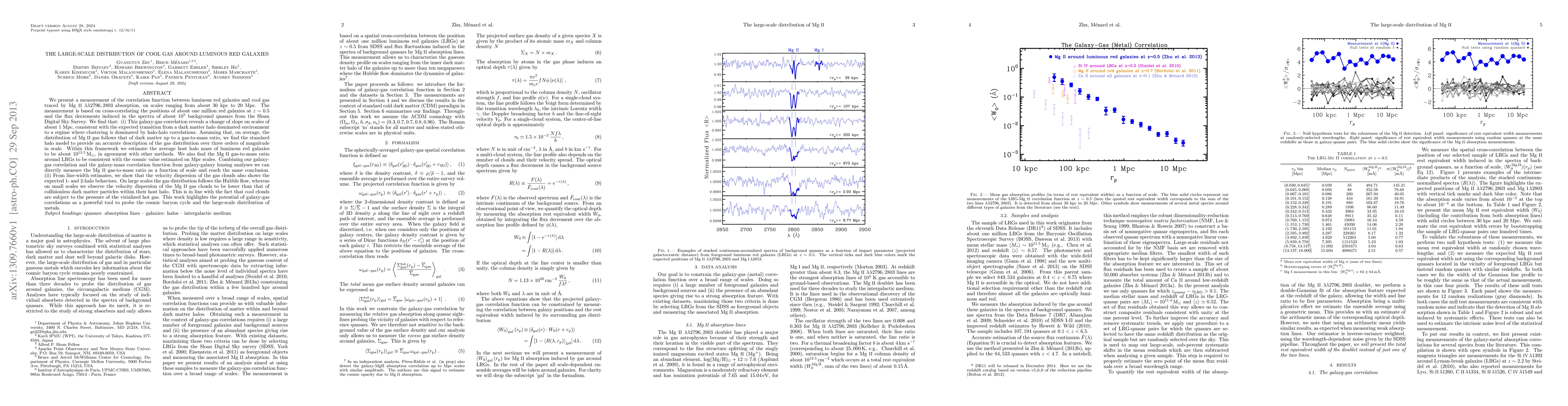 We present a measurement of the correlation function between luminous red galaxies and cool gas traced by Mg II \lambda \lambda 2796, 2803 absorption, on scales ranging from about 30 kpc to 20 Mpc. The measurement is based on cross-correlating the positions of about one million red galaxies at z~0.5 and the flux decrements induced in the spectra of about 10^5 background quasars from the Sloan Digital Sky Survey. We find that: (i) This galaxy-gas correlation reveals a change of slope on scales of about 1 Mpc, consistent with the expected transition from a dark matter halo dominated environment to a regime where clustering is dominated by halo-halo correlations. Assuming that, on average, the distribution of Mg II gas follows that of dark matter up to a gas-to-mass ratio, we find the standard halo model to provide an accurate description of the gas distribution over three orders of magnitude in scale. Within this framework we estimate the average host halo mass of luminous red galaxies to be about 10^{13.5} M_solar, in agreement with other methods. We also find the Mg II gas-to-mass ratio around LRGs to be consistent with the cosmic value estimated on Mpc scales. Combining our galaxy-gas correlation and the galaxy-mass correlation function from galaxy-galaxy lensing analyses we can directly measure the Mg II gas-to-mass ratio as a function of scale and reach the same conclusion. (ii) From line-width estimates, we show that the velocity dispersion of the gas clouds also shows the expected 1- and 2-halo behaviors. On large scales the gas distribution follows the Hubble flow, whereas on small scales we observe the velocity dispersion of the Mg II gas clouds to be lower than that of collisionless dark matter particles within their host halo. This is in line with the fact that cool clouds are subject to the pressure of the virialized hot gas.