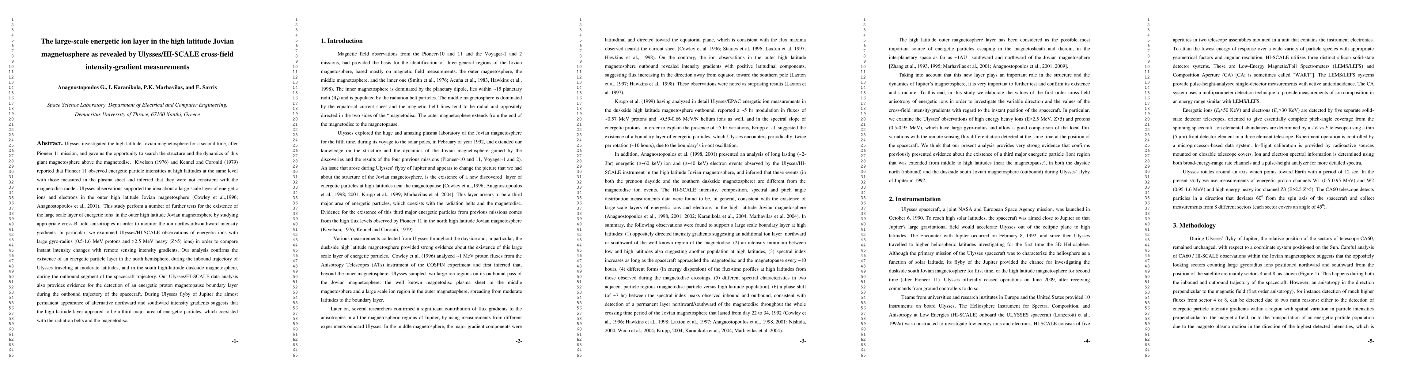 This study uses Ulysses/HI-SCALE data to confirm the existence of a large-scale energetic ion layer in the high-latitude Jovian magnetosphere, revealing significant northward/southward intensity gradients. The analysis identifies this layer as a third major area of energetic particles, coexisting with radiation belts and the magnetodisc.