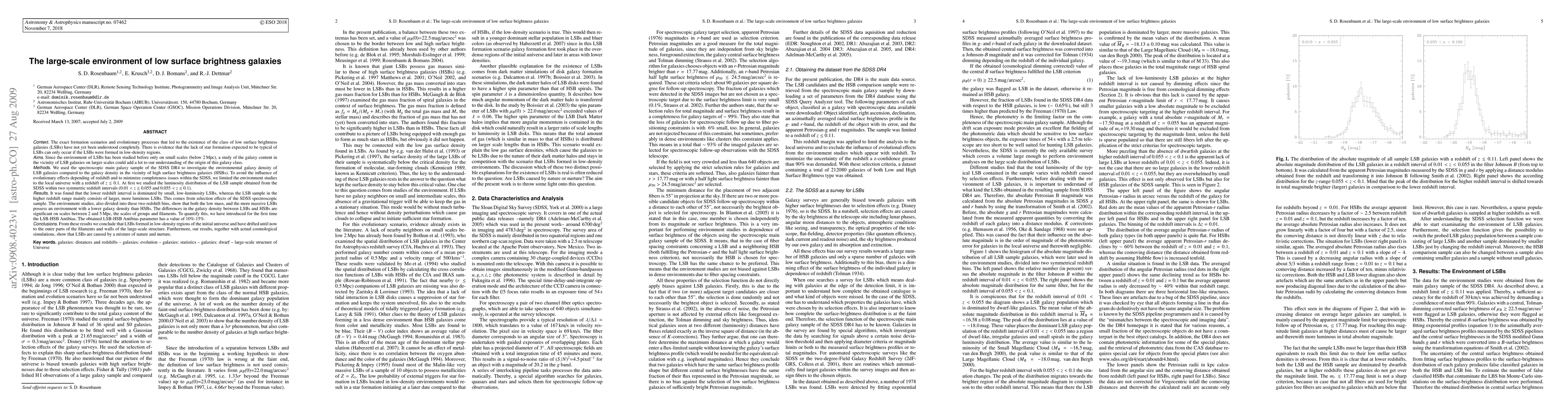 The exact formation scenarios and evolutionary processes that led to the existence of the class of low surface brightness galaxies (LSBs) have not yet been understood completely. Since the environment of LSBs has been studied before only on small scales (below 2 Mpc), a study of the galaxy content in the vicinity of LSB galaxies on larger scales could add a lot to our understanding of the origin of this galaxy class. We used the spectroscopic main galaxy sample of the SDSS DR4 to investigate the environmental galaxy density of LSB galaxies compared to the galaxy density in the vicinity of high surface brightness galaxies (HSBs). The environment studies, divided into two redshift bins, show that both the low mass, and the more massive LSBs possess an environment with a lower galaxy density than HSBs. The differences in the galaxy density between LSBs and HSBs are significant on scales between 2 and 5 Mpc, the scales of groups and filaments. To quantify this, we have introduced for the first time the LSB-HSB Antibias. The obtained LSB-HSB Antibias parameter has a value of 10%-15%. From these results we conclude that LSBs formed in low-density regions of the initial universe and have drifted until now to the outer parts of the filaments and walls of the large-scale structure. Furthermore, our results, together with actual cosmological simulations, show that LSBs are caused by a mixture of nature and nurture.