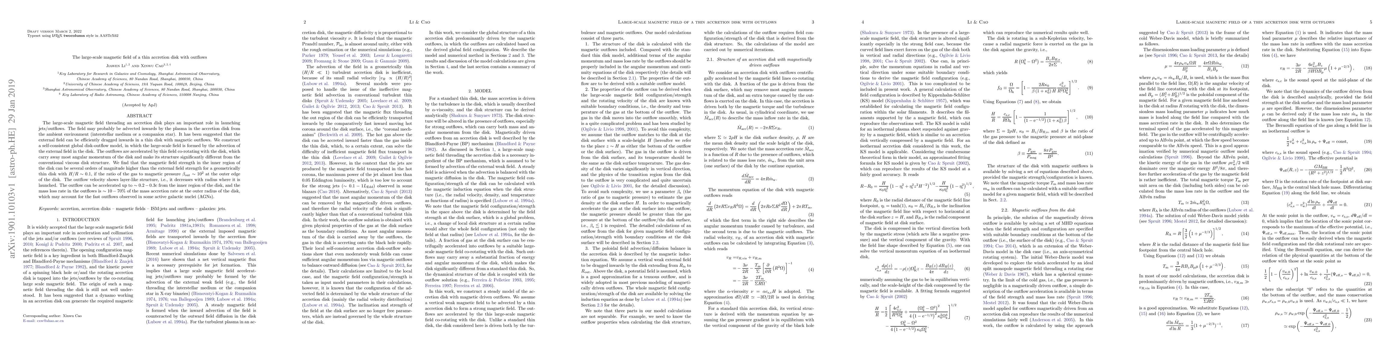 This paper investigates the large-scale magnetic field in thin accretion disks with outflows, showing that the field can be advected inward and significantly influence disk dynamics. The model predicts strong magnetic fields in the inner disk, outflow velocities up to 0.2-0.3c, and mass loss rates that may explain fast outflows observed in active galactic nuclei.