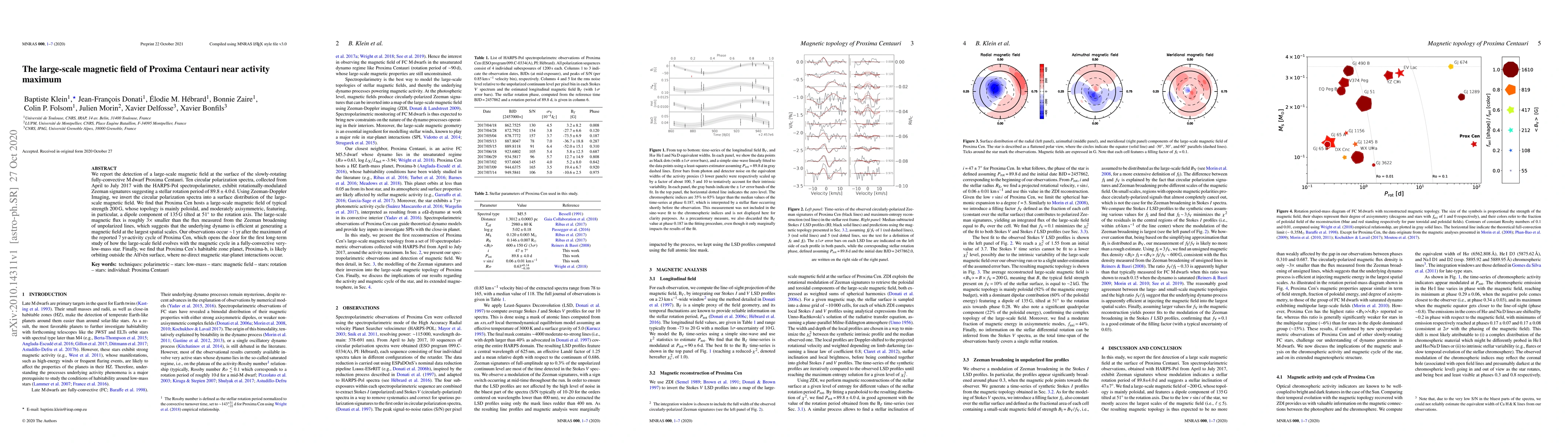 This paper reports the detection of a large-scale magnetic field on Proxima Centauri, revealing a poloidal topology and a dipole component, observed near the activity maximum of its 7 yr cycle. The findings suggest efficient dynamo action and provide a baseline for studying magnetic field evolution in a fully-convective M dwarf.