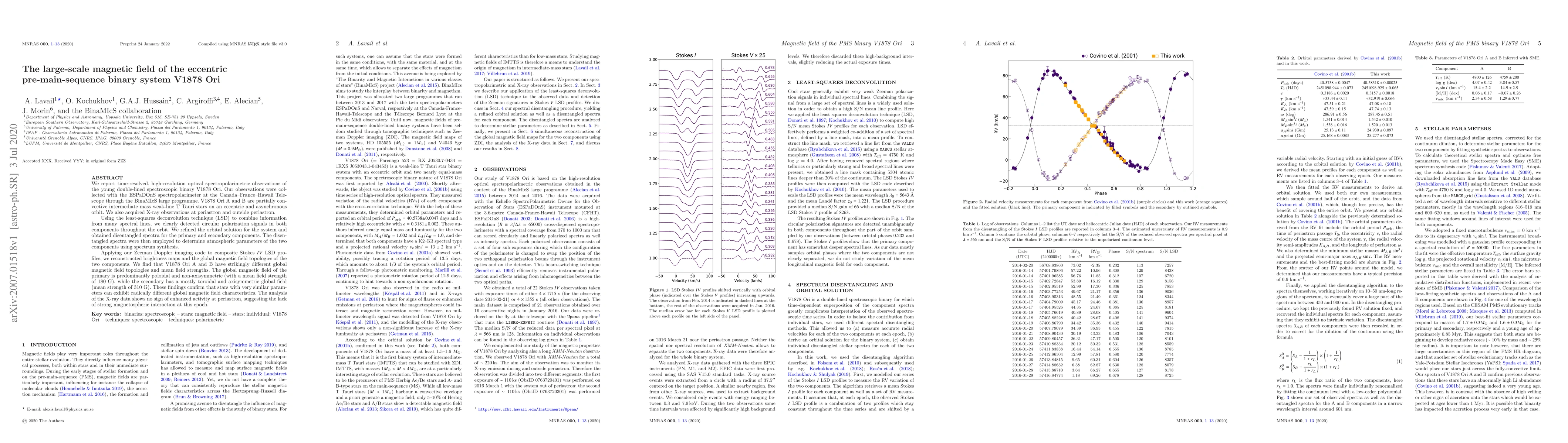 We report time-resolved, high-resolution optical spectropolarimetric observations of the young double-lined spectroscopic binary V1878 Ori. Our observations were collected with the ESPaDOnS spectropolarimeter at the Canada-France-Hawaii Telescope through the BinaMIcS large programme. V1878 Ori A and B are partially convective intermediate mass weak-line T Tauri stars on an eccentric and asynchronous orbit. We also acquired X-ray observations at periastron and outside periastron. Using the least-squares deconvolution technique (LSD) to combine information from many spectral lines, we clearly detected circular polarization signals in both components throughout the orbit. We refined the orbital solution for the system and obtained disentangled spectra for the primary and secondary components. The disentangled spectra were then employed to determine atmospheric parameters of the two components using spectrum synthesis. Applying our Zeeman Doppler imaging code to composite Stokes $IV$ LSD profiles, we reconstructed brightness maps and the global magnetic field topologies of the two components. We find that V1878 Ori A and B have strikingly different global magnetic field topologies and mean field strengths. The global magnetic field of the primary is predominantly poloidal and non-axisymmetric (with a mean field strength of 180 G). while the secondary has a mostly toroidal and axisymmetric global field (mean strength of 310 G). These findings confirm that stars with very similar parameters can exhibit radically different global magnetic field characteristics. The analysis of the X-ray data shows no sign of enhanced activity at periastron, suggesting the lack of strong magnetospheric interaction at this epoch.