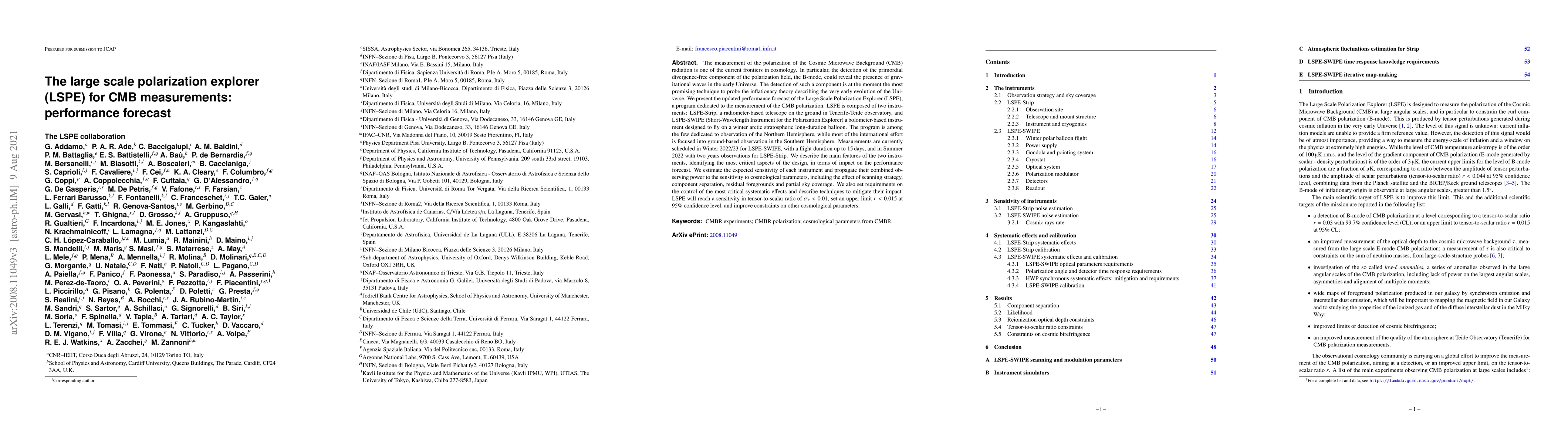 The Large Scale Polarization Explorer (LSPE) aims to measure the polarization of the Cosmic Microwave Background (CMB) to detect primordial B-modes, which could indicate gravitational waves from the early Universe. LSPE consists of two instruments: Strip and SWIPE, with scheduled observations in 2021/22 and 2021 respectively, and forecasts a sensitivity of $\sigma_r<0.01$ to the tensor-to-scalar ratio.