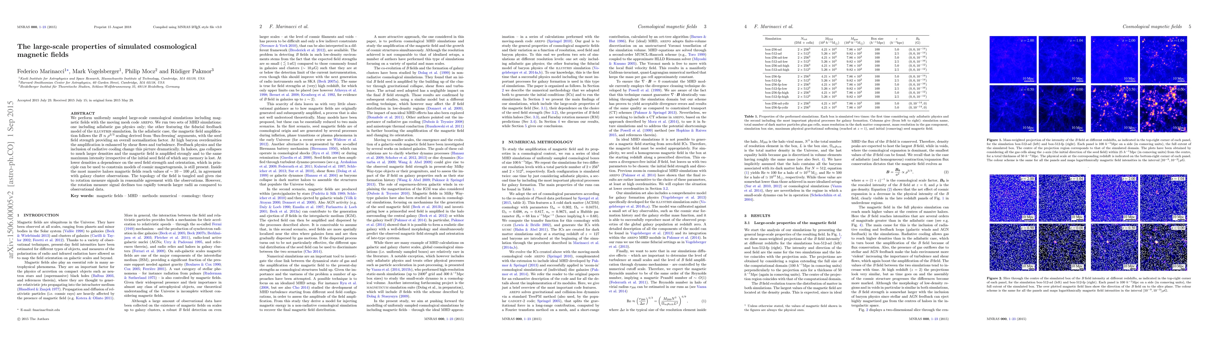 We perform uniformly sampled large-scale cosmological simulations including magnetic fields with the moving mesh code AREPO. We run two sets of MHD simulations: one including adiabatic gas physics only; the other featuring the fiducial feedback model of the Illustris simulation. In the adiabatic case, the magnetic field amplification follows the $B \propto \rho^{2/3}$ scaling derived from `flux-freezing' arguments, with the seed field strength providing an overall normalization factor. At high baryon overdensities the amplification is enhanced by shear flows and turbulence. Feedback physics and the inclusion of radiative cooling change this picture dramatically. In haloes, gas collapses to much larger densities and the magnetic field is amplified strongly and to the same maximum intensity irrespective of the initial seed field of which any memory is lost. At lower densities a dependence on the seed field strength and orientation, which in principle can be used to constrain models of cosmic magnetogenesis, is still present. Inside the most massive haloes magnetic fields reach values of $\sim 10-100\,\,{\rm \mu G}$, in agreement with galaxy cluster observations. The topology of the field is tangled and gives rise to rotation measure signals in reasonable agreement with the observations. However, the rotation measure signal declines too rapidly towards larger radii as compared to observational data.