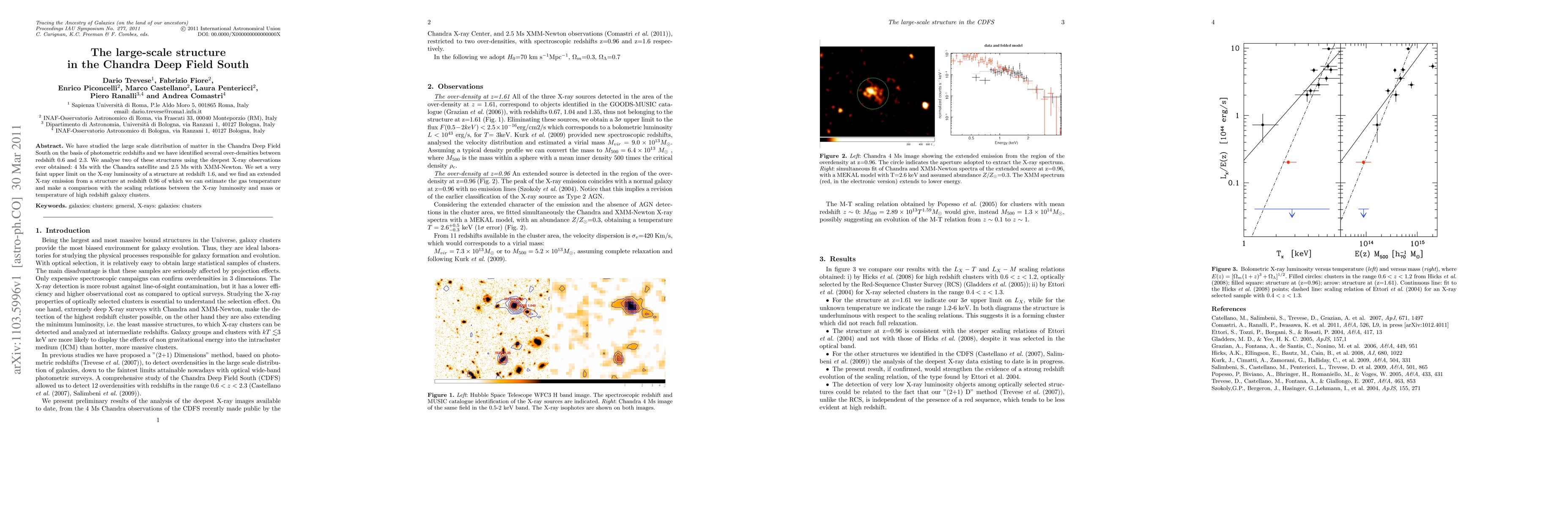This study examines large-scale matter distribution in the Chandra Deep Field South using photometric redshifts, identifying over-densities from redshift 0.6 to 2.3. By analyzing deep X-ray observations from Chandra (4 Ms) and XMM-Newton (2.5 Ms), the researchers set upper limits on X-ray luminosity for a structure at redshift 1.6 and characterize extended X-ray emission from a structure at redshift 0.96, estimating gas temperature and comparing it to high-redshift galaxy cluster scaling relations.
