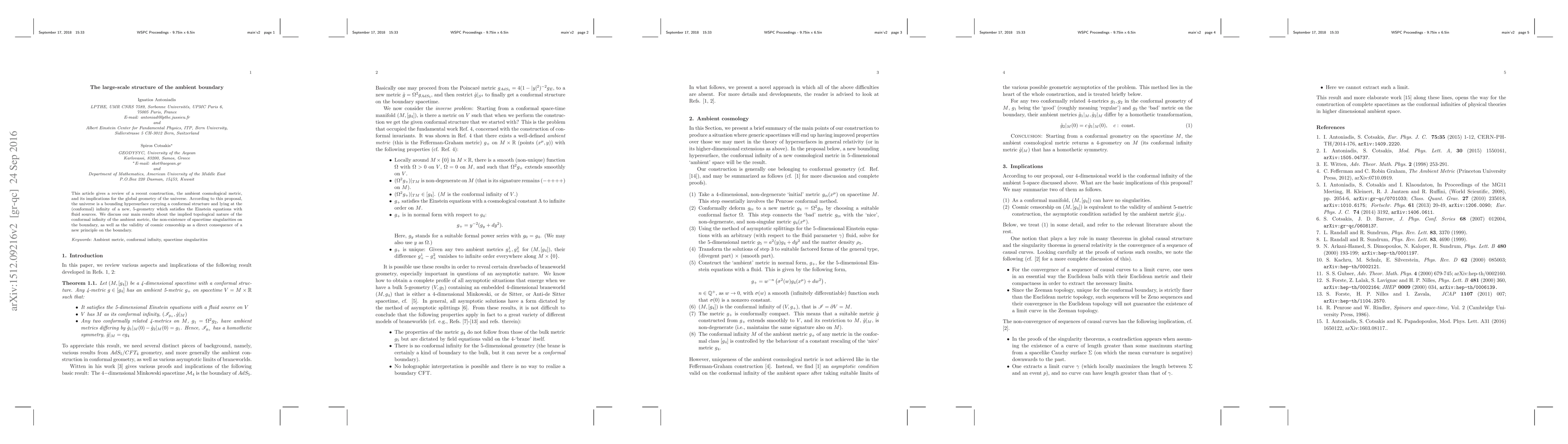 This article gives a review of a recent construction, the ambient cosmological metric, and its implications for the global geometry of the universe. According to this proposal, the universe is a bounding hypersurface carrying a conformal structure and lying at the (conformal) infinity of a new, 5-geometry which satisfies the Einstein equations with fluid sources. We discuss our main results about the implied topological nature of the conformal infinity of the ambient metric, the non-existence of spacetime singularities on the boundary, as well as the validity of cosmic censorship as a direct consequence of a new principle on the boundary.
