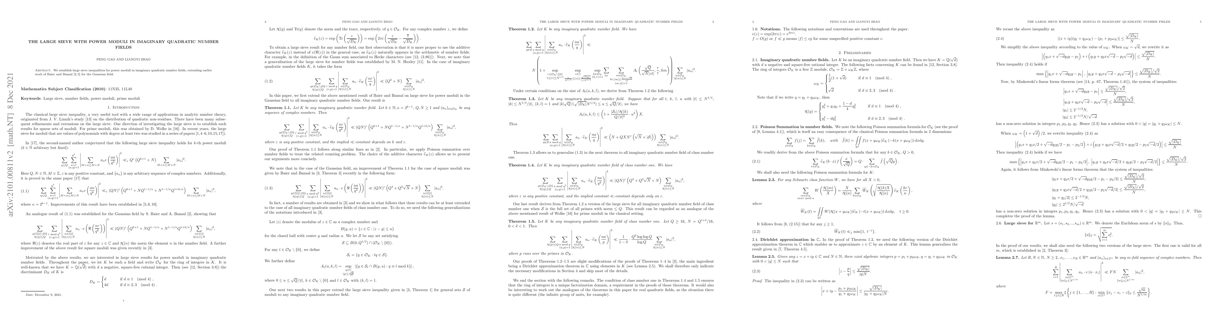 Researchers established large sieve inequalities for power moduli in imaginary quadratic number fields, extending earlier work to the Gaussian field, with implications for cryptography and number theory applications.