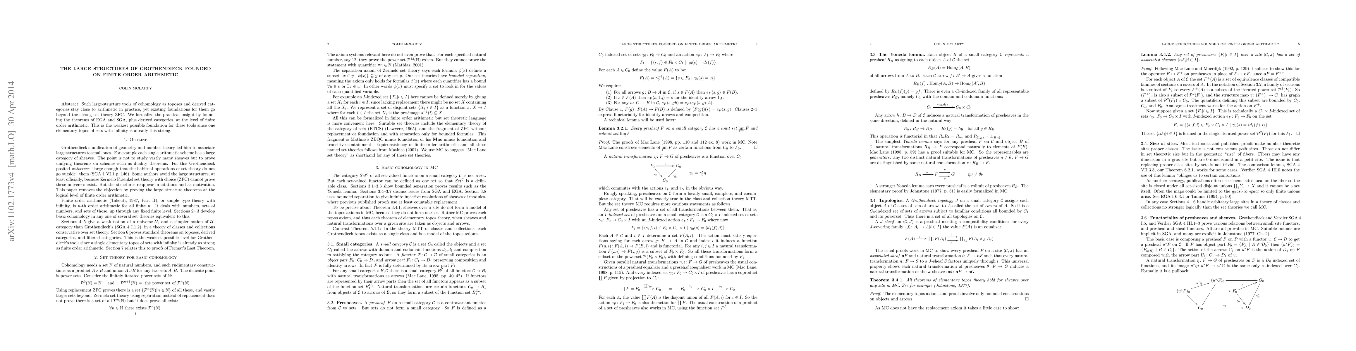 Such large-structure tools of cohomology as toposes and derived categories stay close to arithmetic in practice, yet existing foundations for them go beyond the strong set theory ZFC. We formalize the practical insight by founding the theorems of EGA and SGA, plus derived categories, at the level of finite order arithmetic. This is the weakest possible foundation for these tools since one elementary topos of sets with infinity is already this strong.
