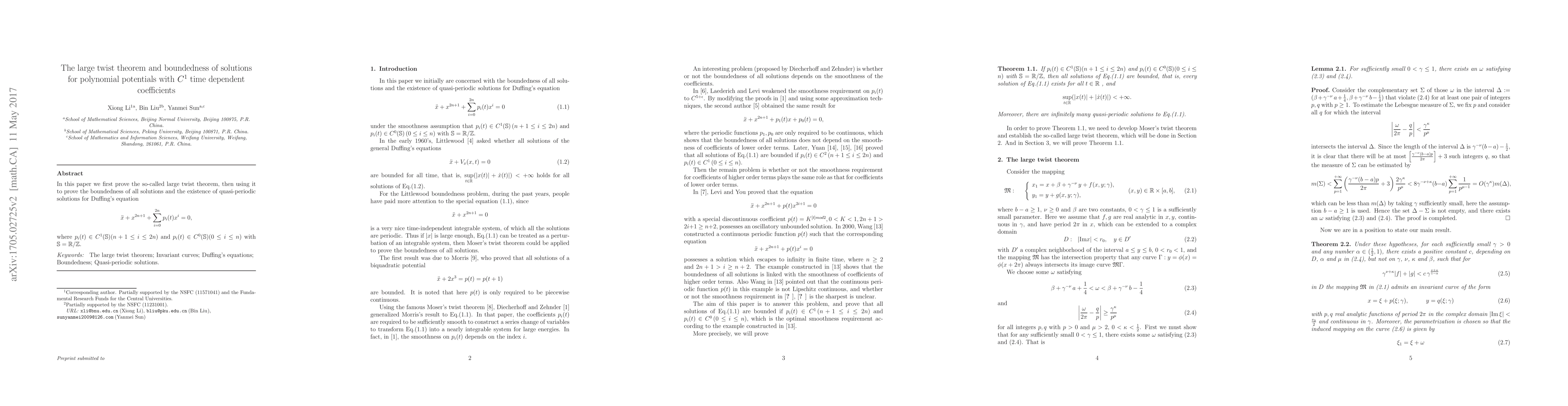 This paper proves the large twist theorem and utilizes it to demonstrate the boundedness and existence of quasi-periodic solutions for Duffing's equation with polynomial potentials and $C^1$ time-dependent coefficients.