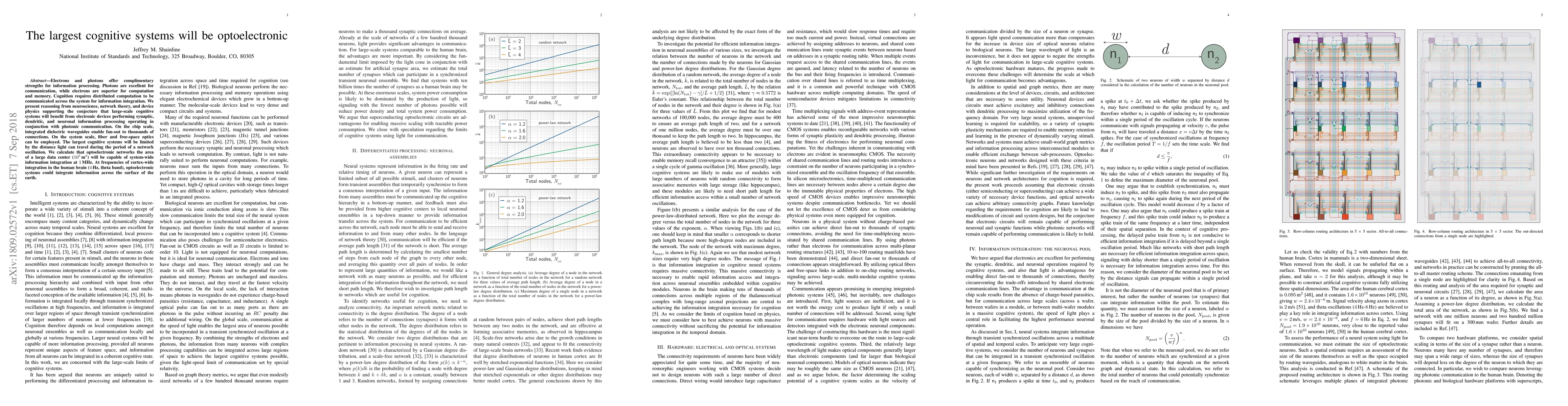 Electrons and photons offer complementary strengths for information processing. Photons are excellent for communication, while electrons are superior for computation and memory. Cognition requires distributed computation to be communicated across the system for information integration. We present reasoning from neuroscience, network theory, and device physics supporting the conjecture that large-scale cognitive systems will benefit from electronic devices performing synaptic, dendritic, and neuronal information processing operating in conjunction with photonic communication. On the chip scale, integrated dielectric waveguides enable fan-out to thousands of connections. On the system scale, fiber and free-space optics can be employed. The largest cognitive systems will be limited by the distance light can travel during the period of a network oscillation. We calculate that optoelectronic networks the area of a large data center ($10^5$\,m$^2$) will be capable of system-wide information integration at $1$\,MHz. At frequencies of cortex-wide integration in the human brain ($4$\,Hz, theta band), optoelectronic systems could integrate information across the surface of the earth.