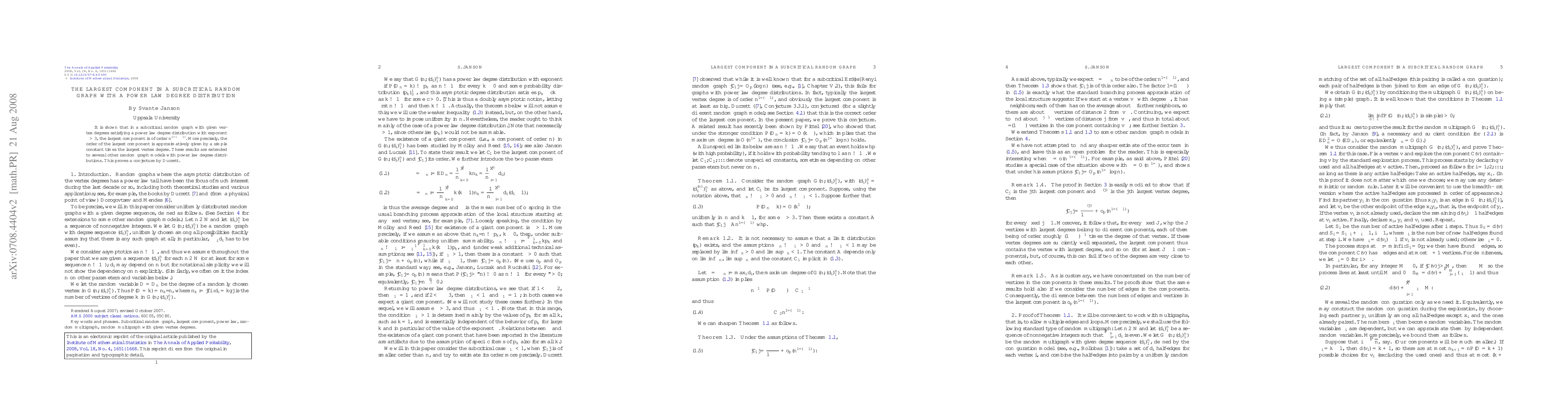 Summary: In subcritical random graphs with power law degree distributions where the exponent $\gamma > 3$, the largest component scales as $n^{1/(\gamma-1)}$, approximately proportional to the largest vertex degree, confirming a conjecture by Durrett. This result extends to various random graph models with similar degree distributions.
