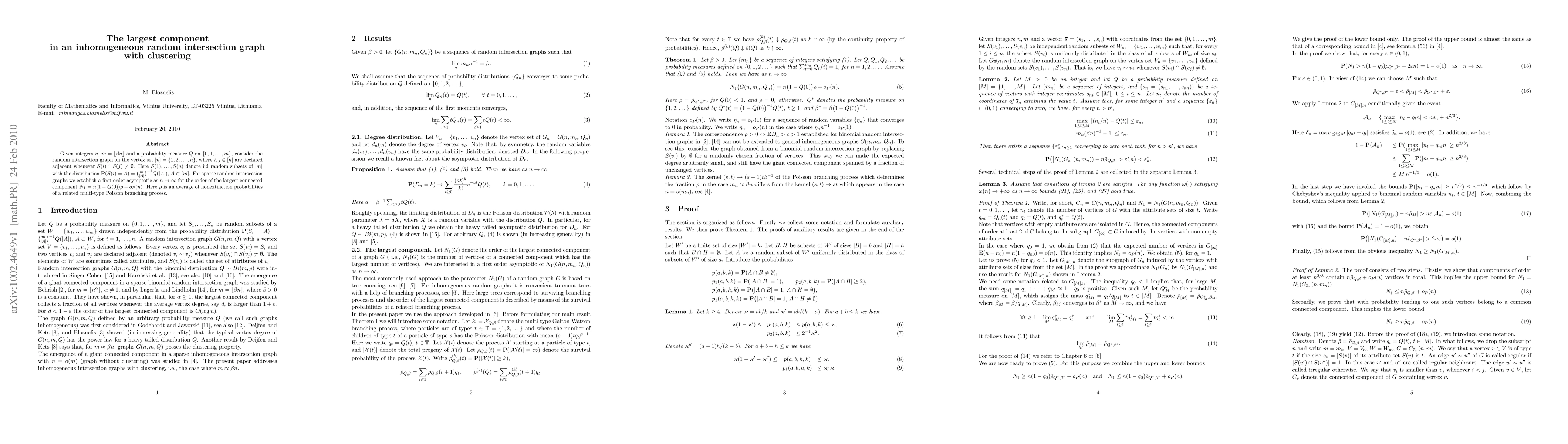 Given b>0, integers n, m=bn and a probability measure Q on {0, 1,..., m}, consider the random intersection graph on the vertex set [n]={1, ..., n}, where i and j are declared adjacent whenever S(i) and S(j) intersect. Here S(1), ..., S(n) denote iid random subsets of [m] such that P(|S(i)|=k)=Q(k). For sparse random intersection graphs we establish a first order asymptotic for the order of the largest connected component N=n(1-Q(0))g+o(n) in probability. Here g is an average of nonextinction probabilities of a related multi-type Poisson branching process.