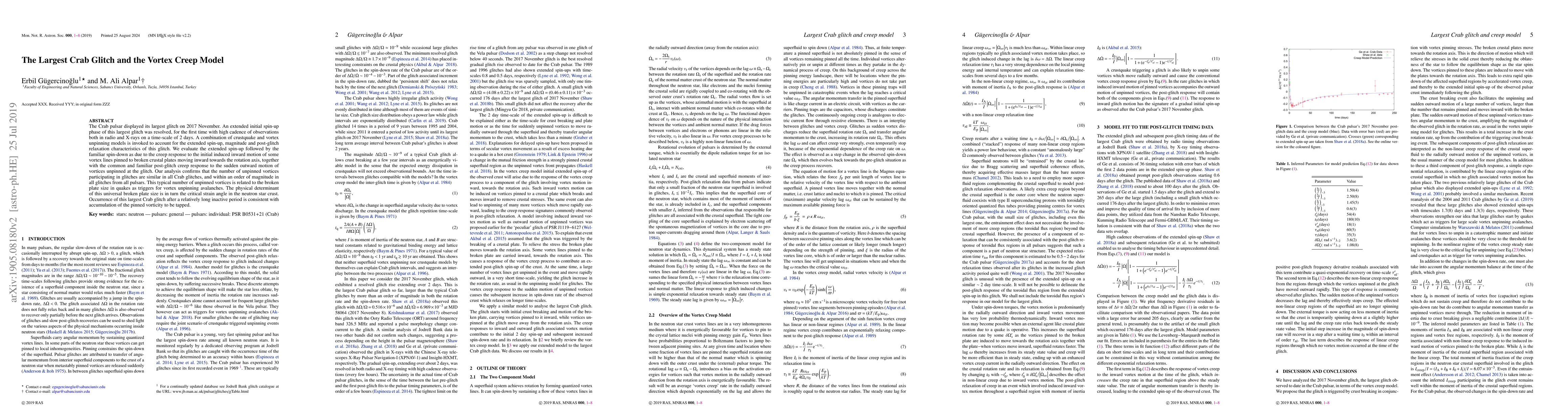 The Crab pulsar's largest glitch in 2017 was analyzed using high-cadence radio and X-ray observations, revealing an extended initial spin-up phase. The extended spin-up and subsequent spin-down were explained through a combination of crustquake and vortex unpinning models, suggesting that the glitch results from vortex creep responses to broken crustal plates.