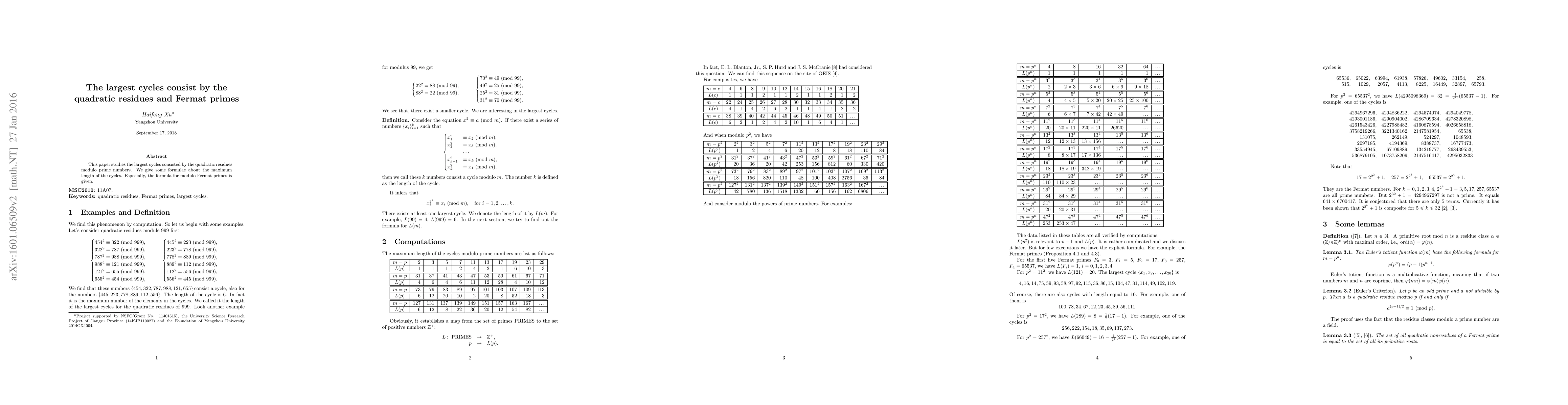 This paper explores the largest cycles formed by quadratic residues modulo prime numbers, providing specific formulae for their maximum lengths, with a particular focus on cycles under Fermat primes.