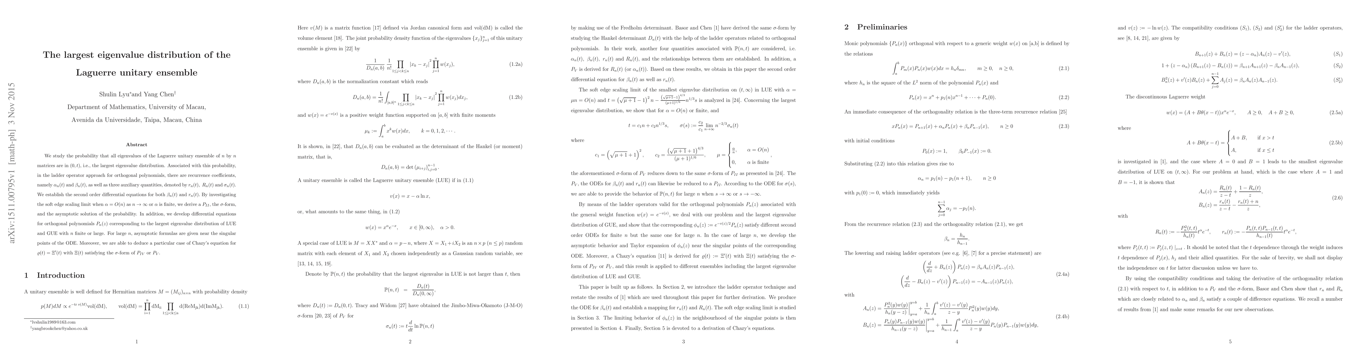 We study the probability that all eigenvalues of the Laguerre unitary ensemble of n by n matrices are between 0 and t, i.e., the largest eigenvalue distribution. Associated with this probability, in the ladder operator approach for orthogonal polynomials, there are recurrence coefficients, namely {\alpha}n(t) and \b{eta}n(t), as well as three auxiliary quantities, denoted by rn(t), Rn(t) and sigma n(t). We establish the second order differential equations for both beta n(t) and rn(t). By investigating the soft edge scaling limit when alpha = O(n) as n ! 1 or alpha is finite, we derive a PII , the sigma-form, and the asymptotic solution of the probability. In addition, we develop differential equations for orthogonal polynomials Pn(z) corresponding to the largest eigenvalue distribution of LUE and GUE with n finite or large. For large n, asymptotic formulas are given near the singular points of the ODE. Moreover, we are able to deduce a particular case of Chazy equation for rho(t) = d/dt(capsigma(t) with capsigma(t) satisfying the sigma-form of PIV or PV . 1 I