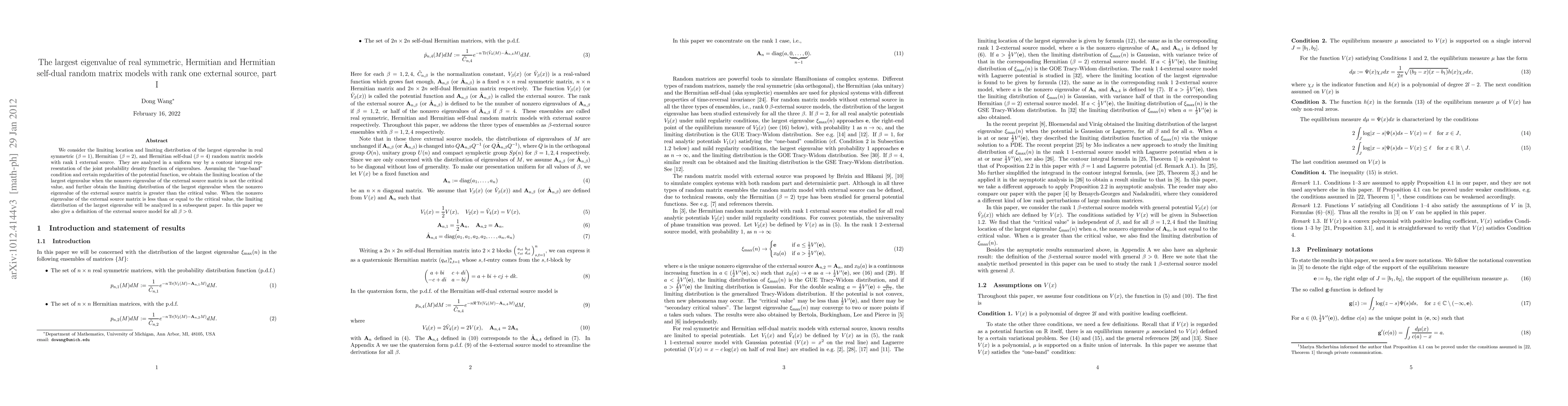 This paper investigates the limiting behavior of the largest eigenvalue in real symmetric, Hermitian, and Hermitian self-dual random matrix models with a rank one external source. It provides a contour integral representation to analyze the joint probability density function and derives the limiting location and distribution of the largest eigenvalue under specific conditions.