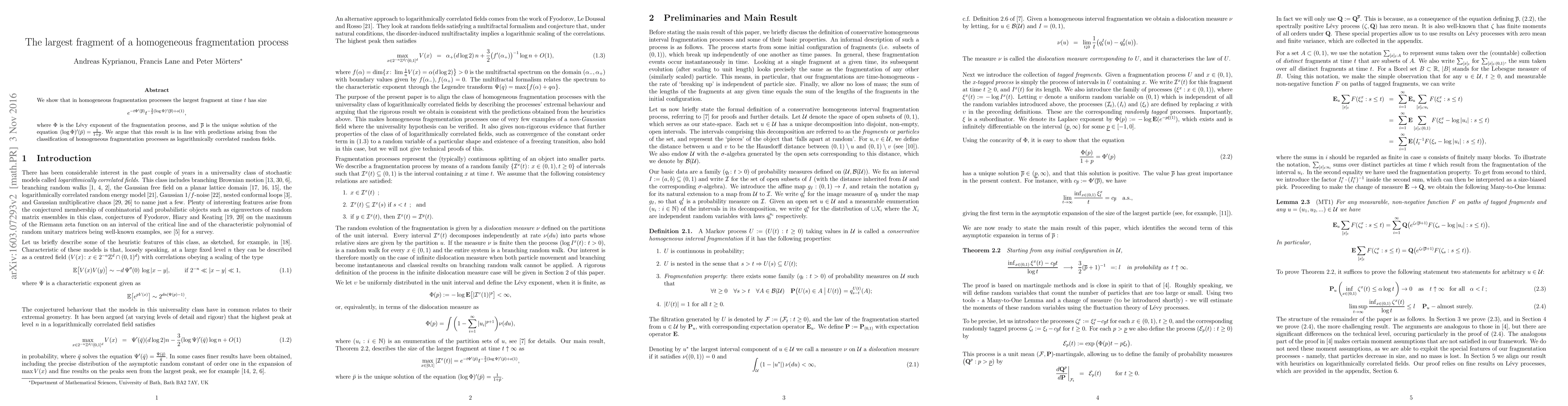We show that in homogeneous fragmentation processes the largest fragment at time $t$ has size $e^{-t \Phi'(\bar{p})}t^{-\frac32 (\log \Phi)'(\bar{p})+o(1)},$ where $\Phi$ is the L\'evy exponent of the fragmentation process, and $\bar{p}$ is the unique solution of the equation $(\log \Phi)'(\bar{p})=\frac1{1+\bar{p}}$. We argue that this result is in line with predictions arising from the classification of homogeneous fragmentation processes as logarithmically correlated random fields.