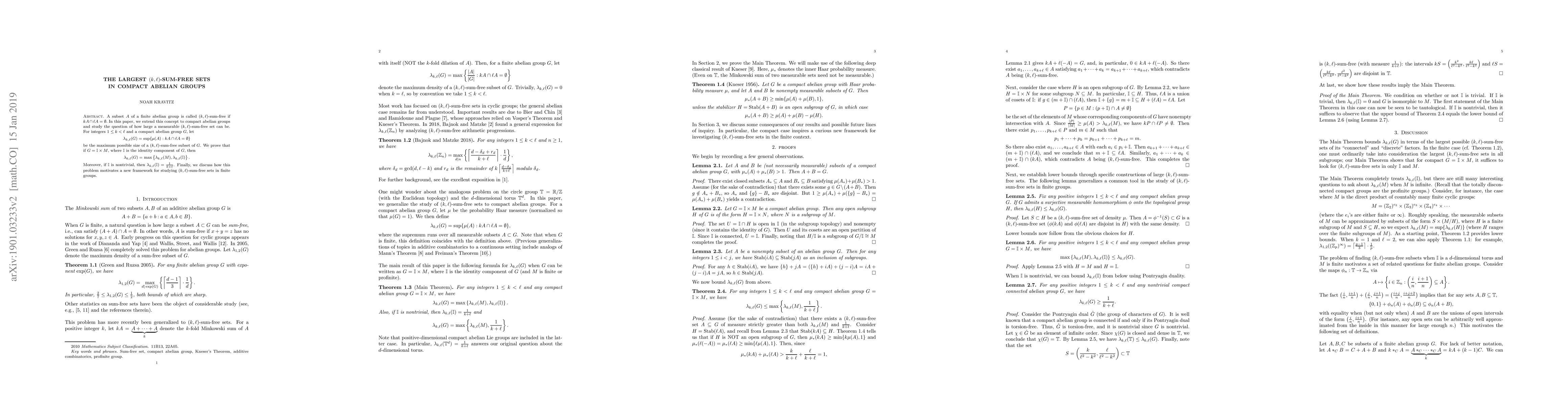 A subset $A$ of a finite abelian group is called $(k,\ell)$-sum-free if $kA \cap \ell A=\emptyset.$ In this paper, we extend this concept to compact abelian groups and study the question of how large a measurable $(k,\ell)$-sum-free set can be. For integers $1 \leq k <\ell$ and a compact abelian group $G$, let $$\lambda_{k,\ell}(G)=\sup\{ \mu(A): kA \cap \ell A =\emptyset \}$$ be the maximum possible size of a $(k,\ell)$-sum-free subset of $G$. We prove that if $G=\mathbb{I} \times M$, where $\mathbb{I}$ is the identity component of $G$, then $$\lambda_{k, \ell}(G)=\max \left\{ \lambda_{k, \ell}(M), \lambda_{k, \ell}(\mathbb{I}) \right\}.$$ Moreover, if $\mathbb{I}$ is nontrivial, then $\lambda_{k,\ell}(\mathbb{I})=\frac{1}{k+\ell}$. Finally, we discuss how this problem motivates a new framework for studying $(k,\ell)$-sum-free sets in finite groups.