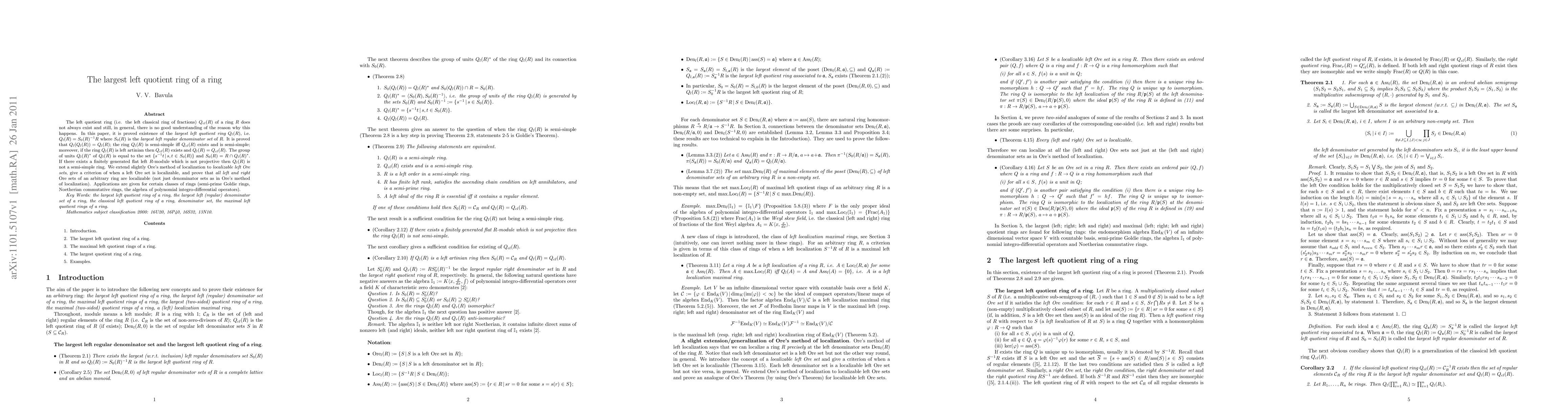 The left quotient ring (i.e. the left classical ring of fractions) $Q_{cl}(R)$ of a ring $R$ does not always exist and still, in general, there is no good understanding of the reason why this happens. In this paper, it is proved existence of the largest left quotient ring $Q_l(R)$, i.e. $Q_l(R) = S_0(R)^{-1}R$ where $S_0(R)$ is the largest left regular denominator set of $R$. It is proved that $Q_l(Q_l(R))=Q_l(R)$; the ring $Q_l(R)$ is semi-simple iff $Q_{cl}(R)$ exists and is semi-simple; moreover, if the ring $Q_l(R)$ is left artinian then $Q_{cl}(R)$ exists and $Q_l(R) = Q_{cl}(R)$. The group of units $Q_l(R)^*$ of $Q_l(R)$ is equal to the set $\{s^{-1} t\, | \, s,t\in S_0(R)\}$ and $S_0(R) = R\cap Q_l(R)^*$. If there exists a finitely generated flat left $R$-module which is not projective then $Q_l(R)$ is not a semi-simple ring. We extend slightly Ore's method of localization to localizable left Ore sets, give a criterion of when a left Ore set is localizable, and prove that all left and right Ore sets of an arbitrary ring are localizable (not just denominator sets as in Ore's method of localization). Applications are given for certain classes of rings (semi-prime Goldie rings, Noetherian commutative rings, the algebra of polynomial integro-differential operators).
